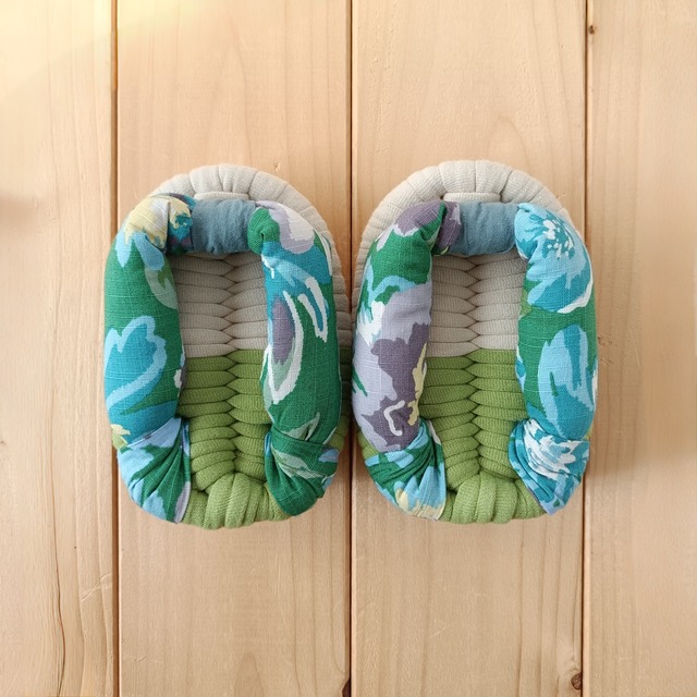 グリーン×ブルーの穏やかな色合いで ほっと心がゆるむ布ぞうりに仕上がりました。 足裏にあたるニット生地は 滑らかな肌触り。 ふんわりと柔らかく 足元を快適に守ってくれます。 ずっと触れていたくなる 履き心地です。 ……………………………………………………………… 【TSUMUGIのこだわりポイント】 ○土台は、肌触りのよい綿100%ニット 夏は、汗ばむ足をさらりと快適に。 冬は、床の底冷えから足を守ってくれます。 ○鼻緒を留める位置は、足指が土台に収まりやすいように左右で変えています。 ○鼻緒を留める布(前坪) 柔らかいワッシャー生地を使用し、リラックス感のある雰囲気に仕上げています。 ○鼻緒の長さ調整 裏の結び目はかわいくリボンにしてあります。 ◯汚れたら洗濯機で洗えます。 ………………………………………………………………… 【受注制作について】 ・靴のサイズを目安に、サイズをお選びください。 ・鼻緒の柄の出方は、お写真と異なります。 ・ご注文から発送までの目安は 「WEB:HOME画面」「アプリ:ショップ情報」にてお知らせしております。 ………………………………………………………………… ☆大切な方への贈り物に… ギフトラッピング・ギフト配送(先方へ直接お届け)はこちらをご一読ください。 https://tsumugizori.base.shop/p/00006 ………………………………………………………………… 【サイズ】 縦幅:ご希望のサイズ 横幅:約9.0㎝ (手作りのため、多少の誤差があります) ・履いているうちに少し広がります。 【素材】 ・土台…綿100%のニット生地 ・鼻緒…綿100%の生地 中はキルト芯を使用 ・中芯…PP ロープを使用しています (商品の特性上、中のロープが見える場合がございます) 【お手入れ方法】 ・鼻緒が緩んできたら、土台の裏から紐を引いて調整していただけます。 ・汚れたら手洗い、またはネットに入れて洗濯機で洗えます(乾燥機使用不可) ・色落ちを避けるため、別洗いをおすすめします。 【ご注意】 階段でのご使用や、床の材質によっては滑りやすい場合があります。 十分ご留意の上ご使用ください。 ………………………………………………………………… 【ご購入前に必ずお読みください】 ○作品について ひとつひとつ手作りのため、サイズには多少の誤差があります。 土台・鼻緒には、いろいろな種類の生地を使用しております。いずれも柔らかく肌触りのよい生地をお選びしておりますが、作品により履き心地が多少異なる場合があります。 ○作品は当サイト以外での販売も行っております。 在庫はすべて共有しており、ご注文のタイミングによっては在庫がない場合もございますのでご了承ください。 ○写真について できるかぎり実物の色や質感をお伝えできるように撮影していますが、ご覧いただいているモニターや環境により、実際の色味と異なる場合があります。 〇配送方法について ・レターパック→布ぞうり1足、または足半1足 ・ゆうパック→2足〜 ☆複数ご購入でレターパックをお選びの場合は、1足ずつ梱包してのお届けとなります。 ☆有料ギフトラッピンングには、ゆうパックをおすすめいたします。 ○キャンセルついて 作品発送後のキャンセルはお受けできませんのでご了承ください。 ○返品交換について 衛生商品のため、明らかな不備があった場合を除きご遠慮いただいております。 ご理解の程よろしくお願いいたします。 ご不明な点などございましたら、お気軽にお問い合わせください。
