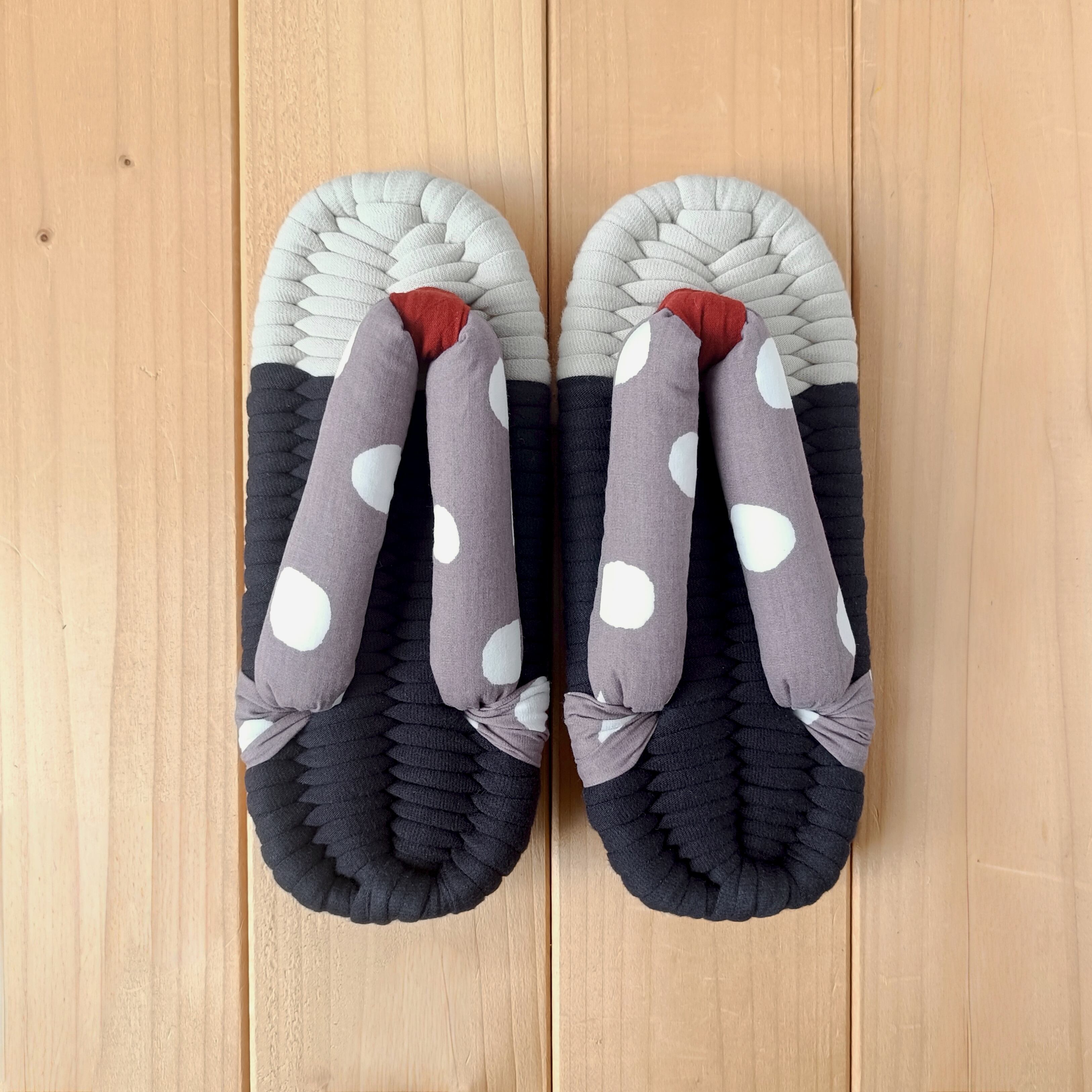 土台・鼻緒には、いろいろな種類の生地を使用しております。いずれも柔らかく肌触りのよい生地をお選びしておりますが、作品により履き心地が多少異なる場合があります。