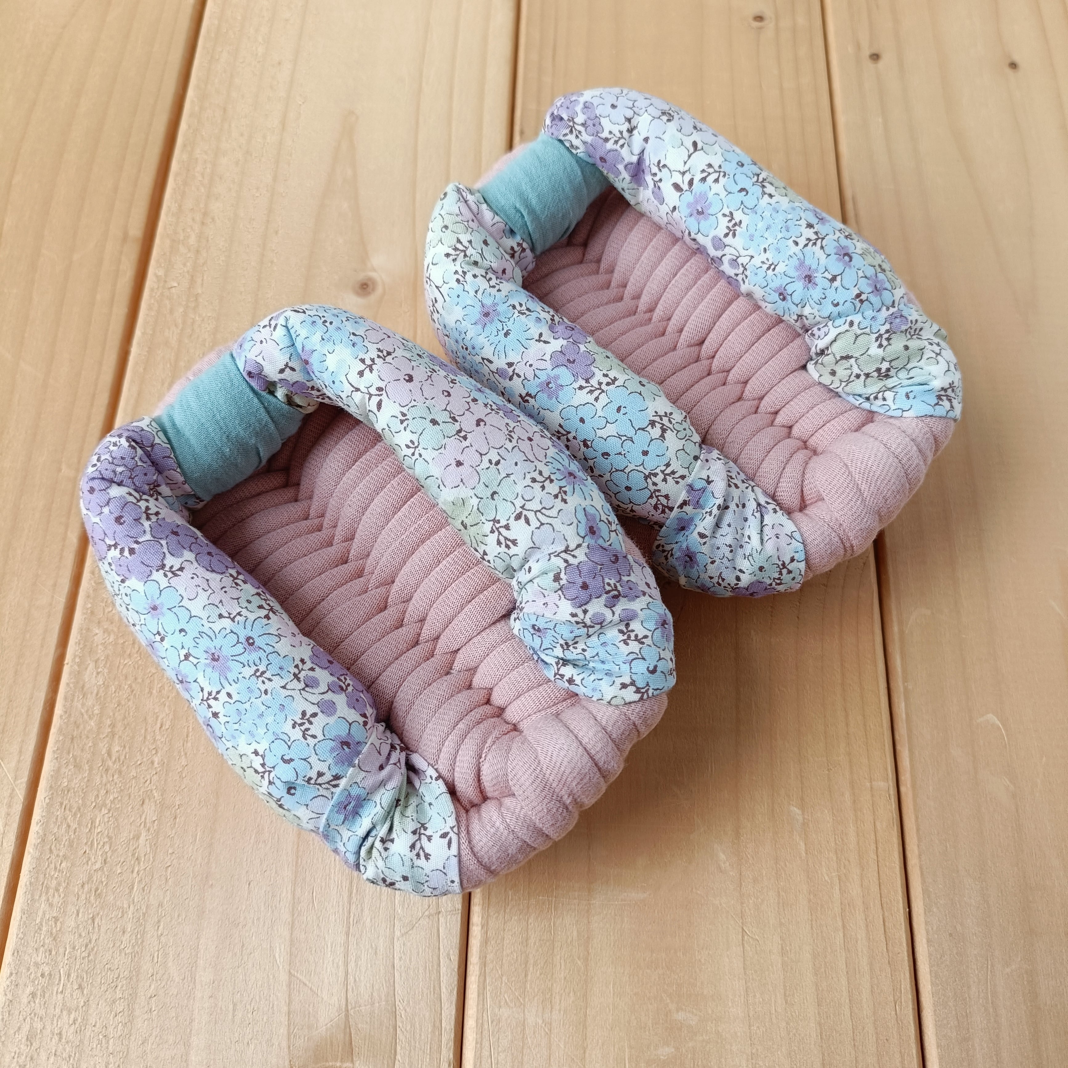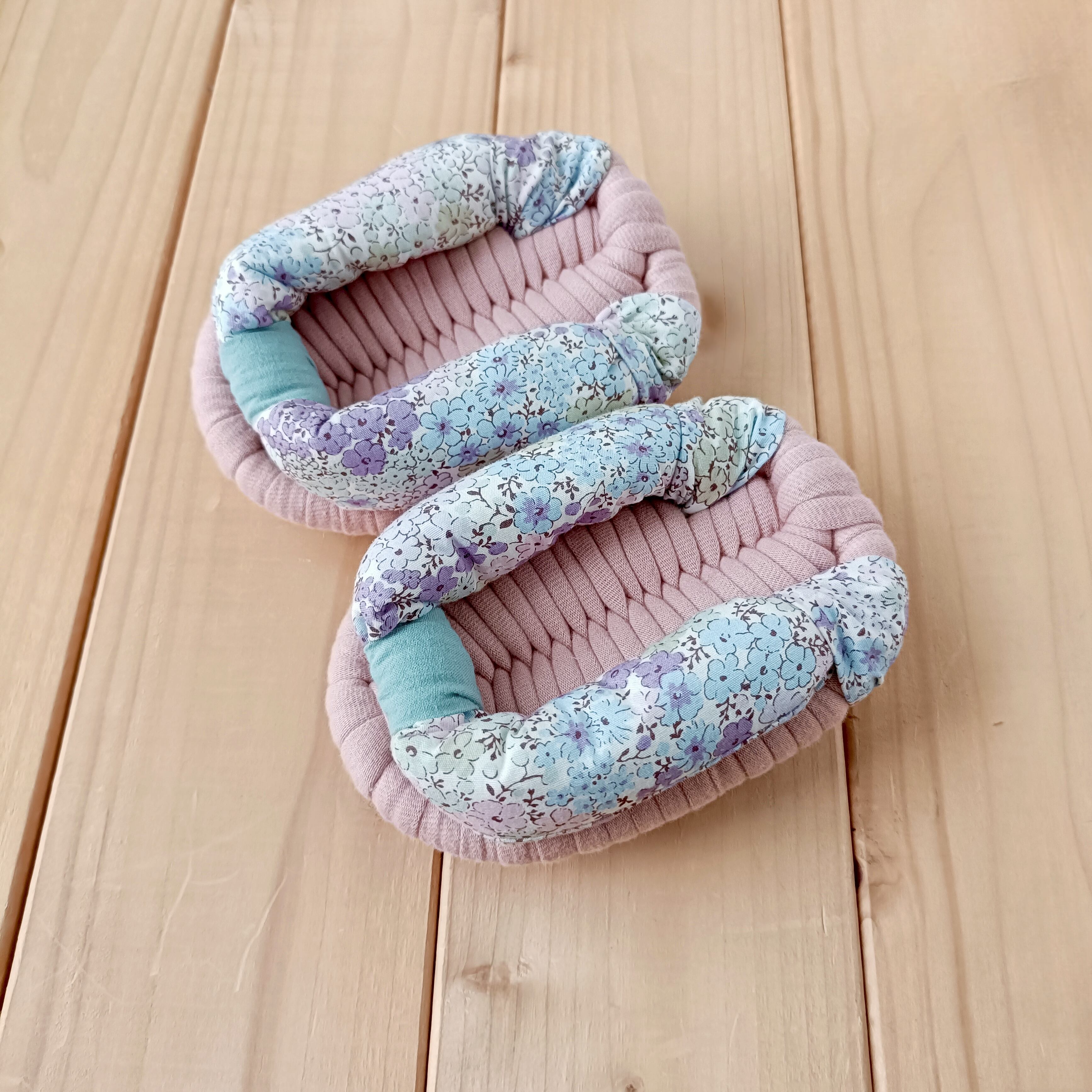 土台・鼻緒には、いろいろな種類の生地を使用しております。いずれも柔らかく肌触りのよい生地をお選びしておりますが、作品により履き心地が多少異なる場合があります。