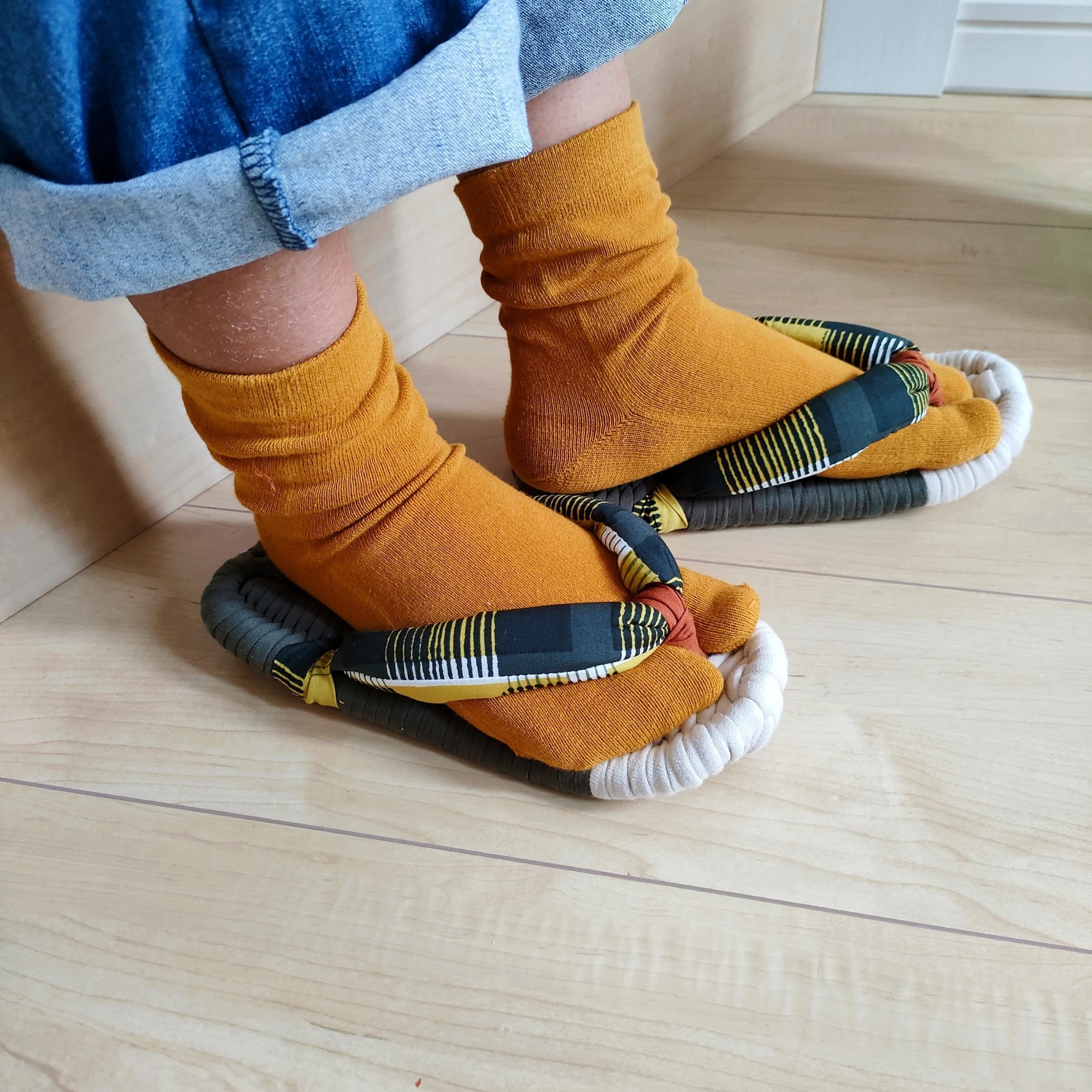 深みのある色合いとシワで、布ぞうり全体がリラックス感のある雰囲気に。