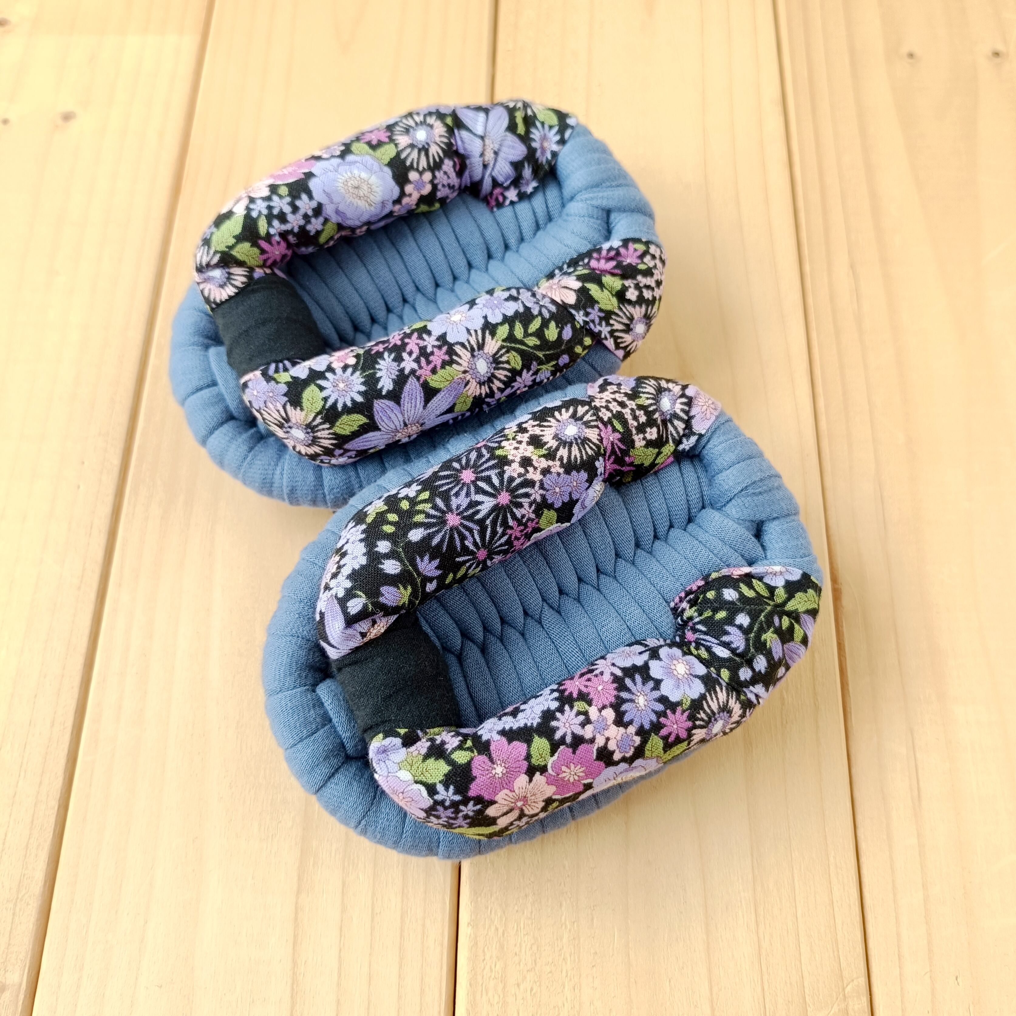 土台・鼻緒には、いろいろな種類の生地を使用しております。いずれも柔らかく肌触りのよい生地をお選びしておりますが、作品により履き心地が多少異なる場合があります。