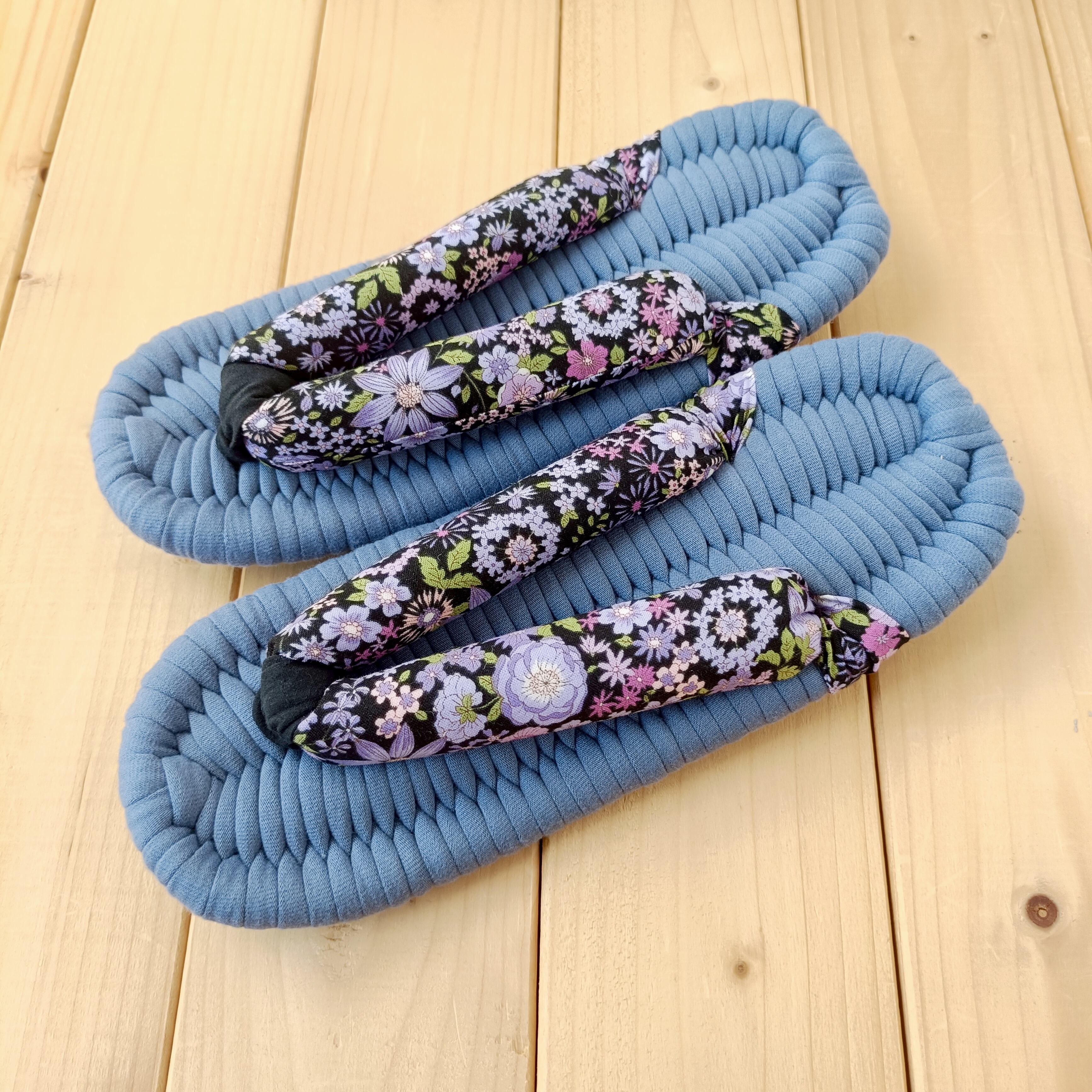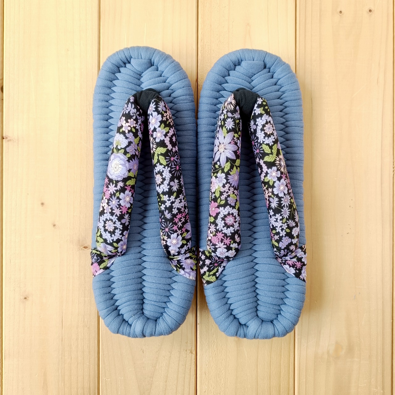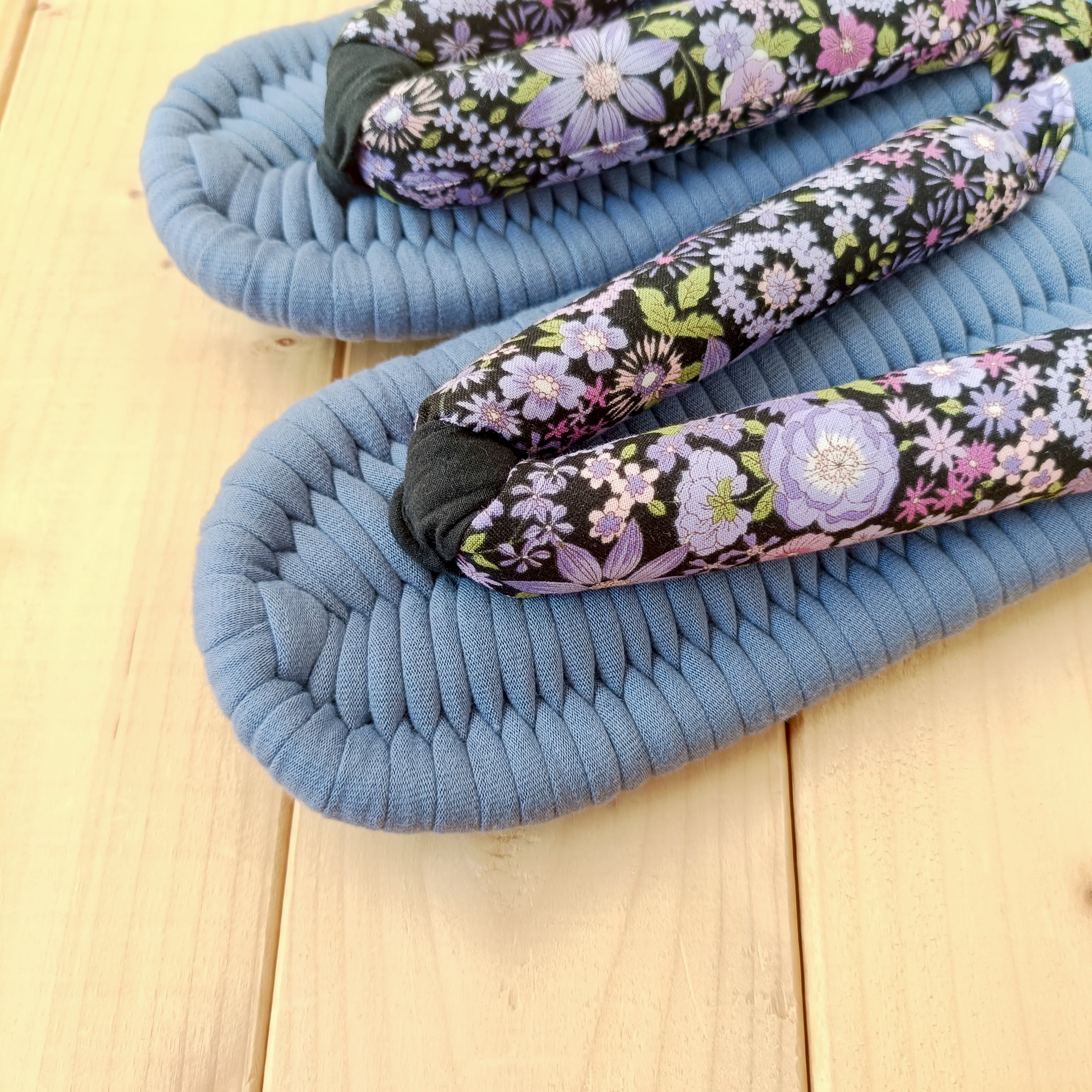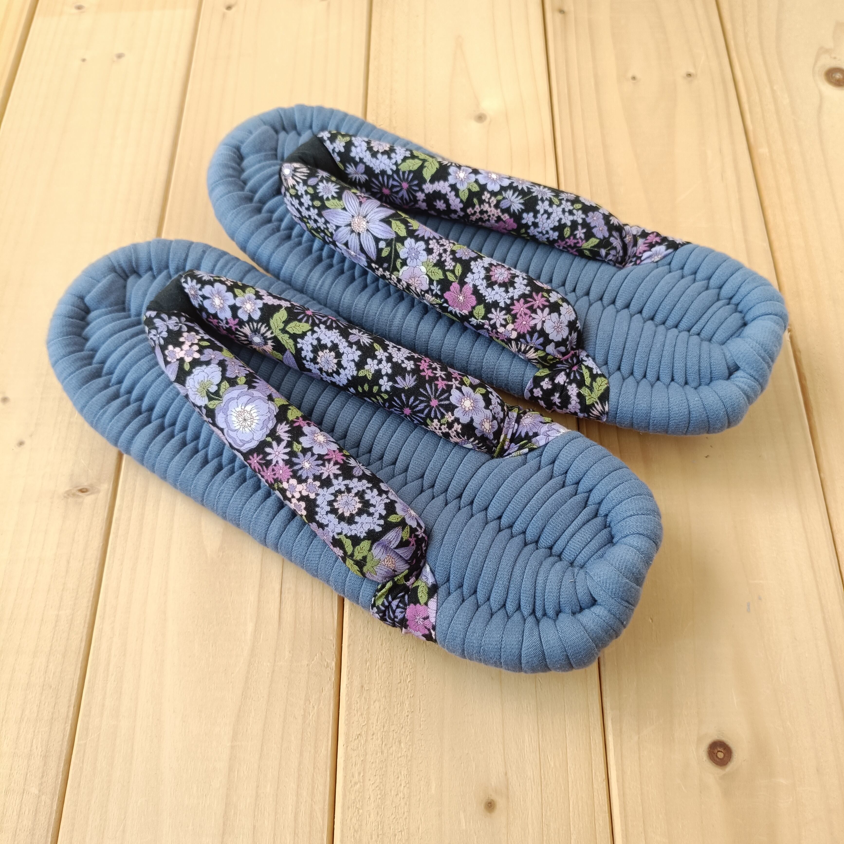 土台・鼻緒には、いろいろな種類の生地を使用しております。いずれも柔らかく肌触りのよい生地をお選びしておりますが、作品により履き心地が多少異なる場合があります。