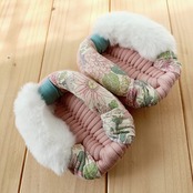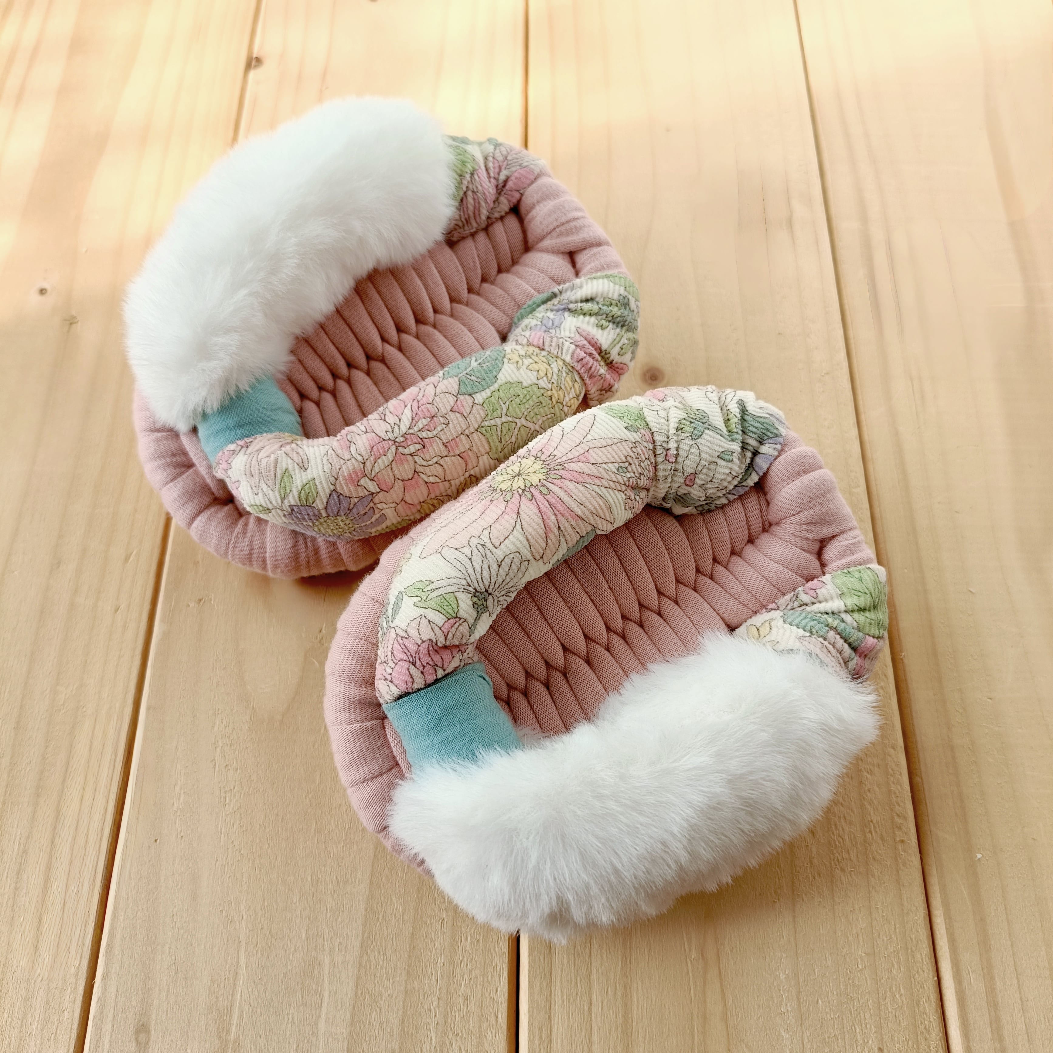 土台・鼻緒には、いろいろな種類の生地を使用しております。いずれも柔らかく肌触りのよい生地をお選びしておりますが、作品により履き心地が多少異なる場合があります。