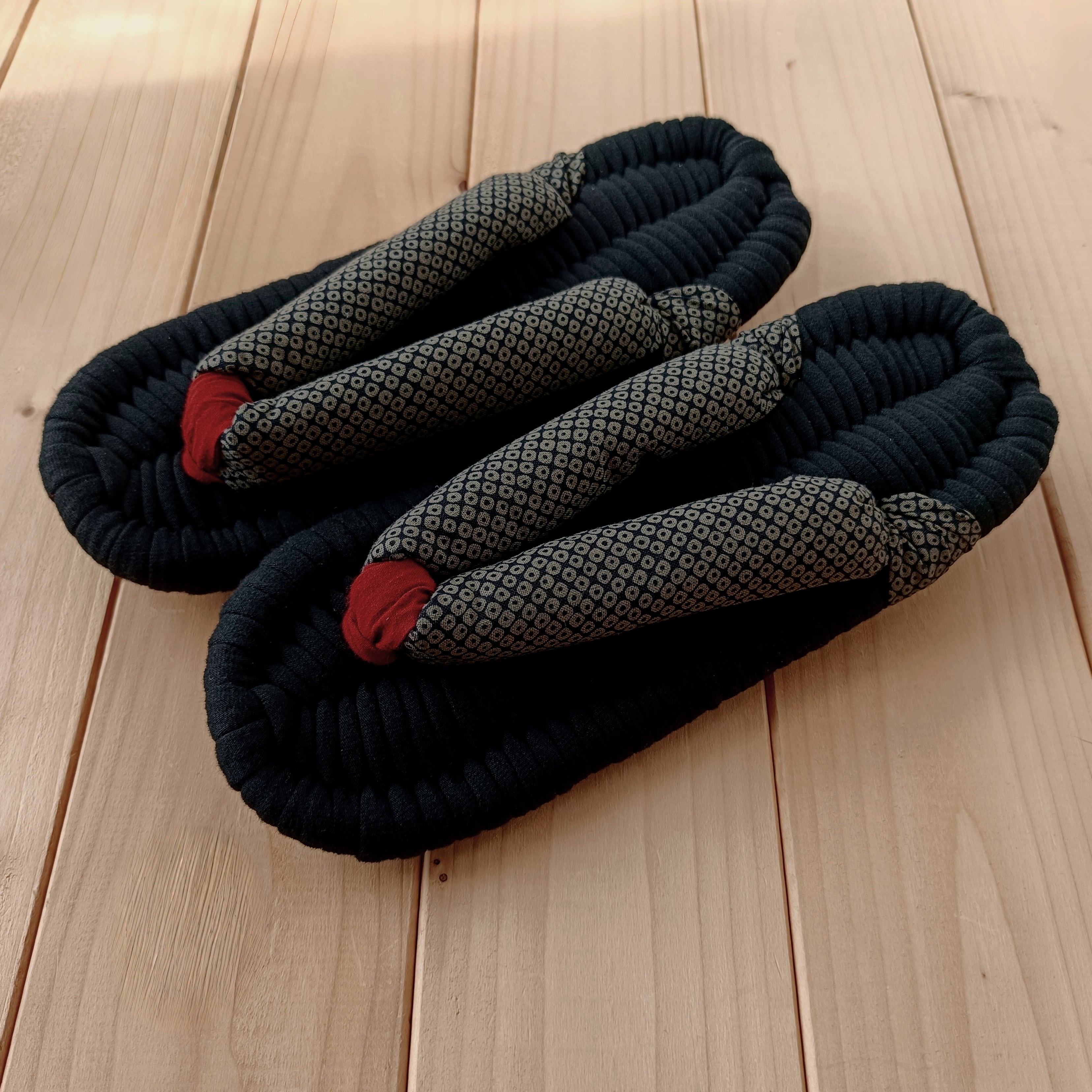 土台・鼻緒には、いろいろな種類の生地を使用しております。いずれも柔らかく肌触りのよい生地をお選びしておりますが、作品により履き心地が多少異なる場合があります。