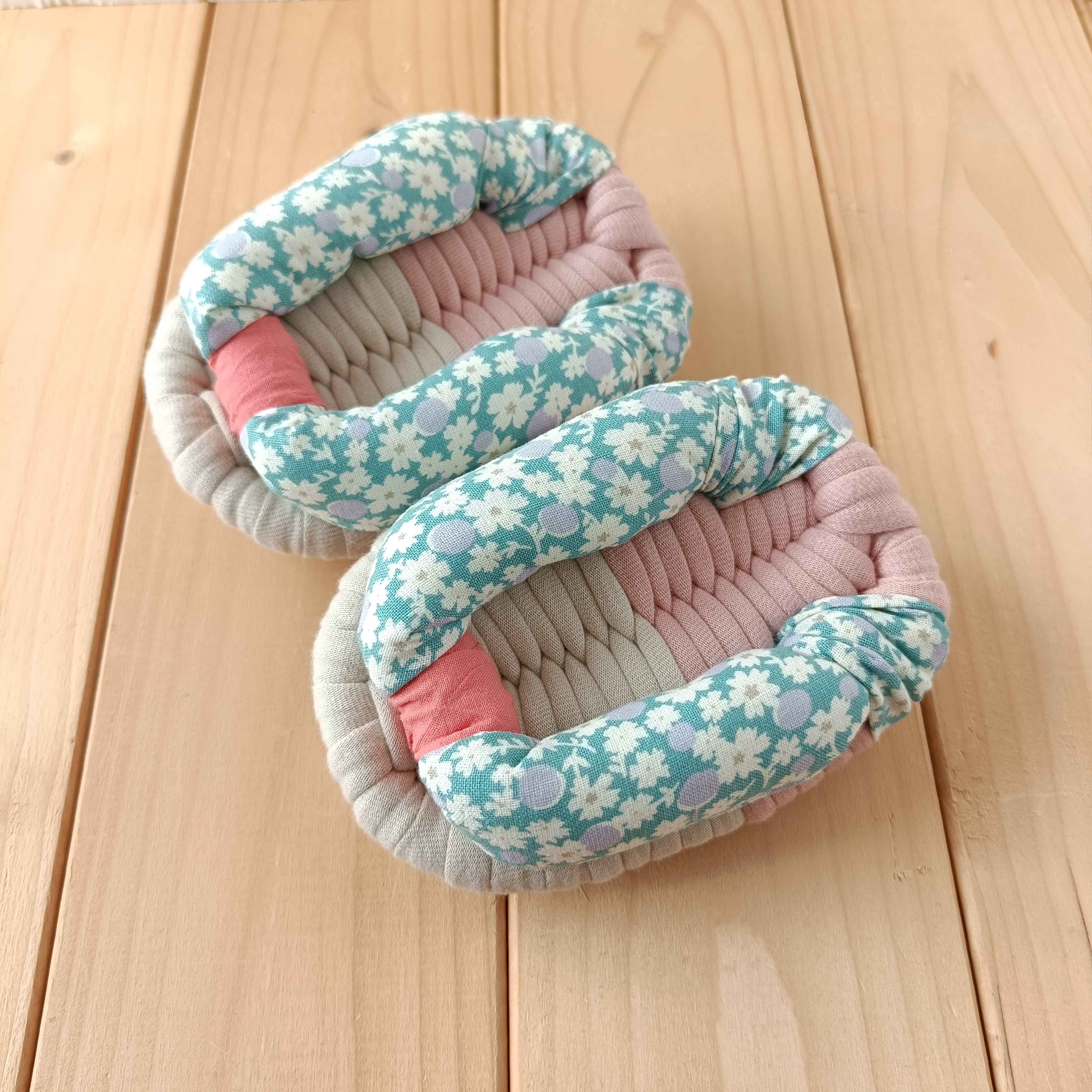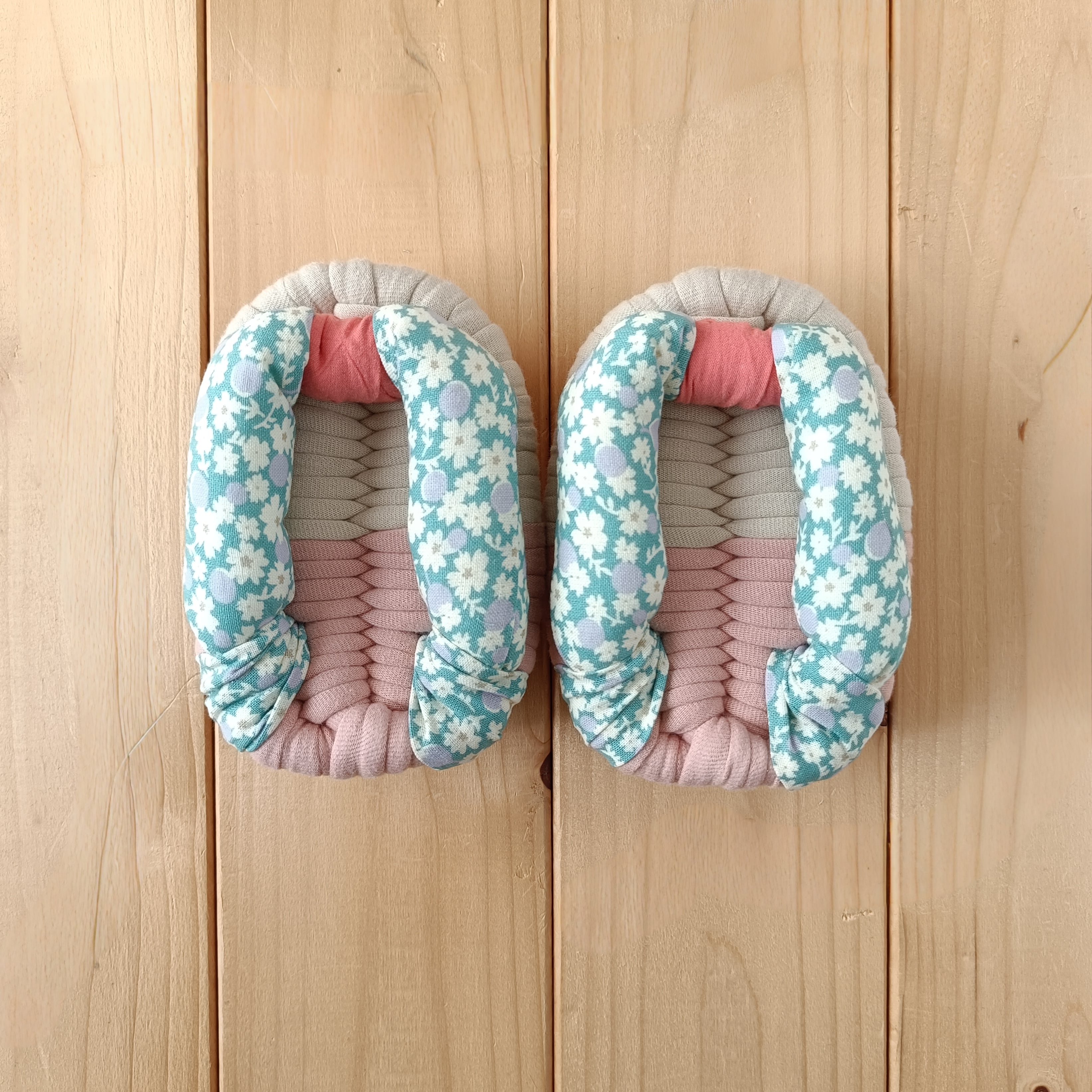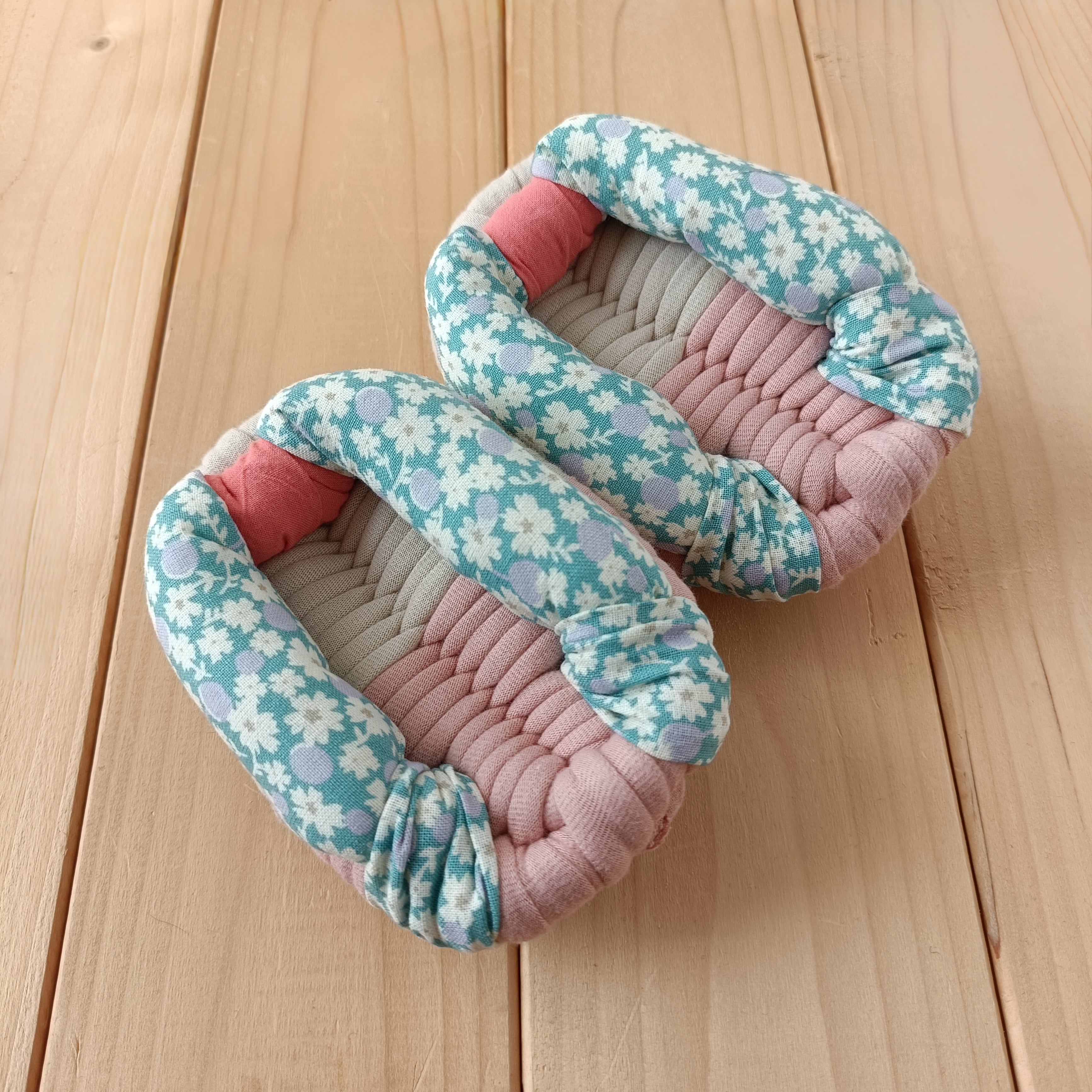 土台・鼻緒には、いろいろな種類の生地を使用しております。いずれも柔らかく肌触りのよい生地をお選びしておりますが、作品により履き心地が多少異なる場合があります。