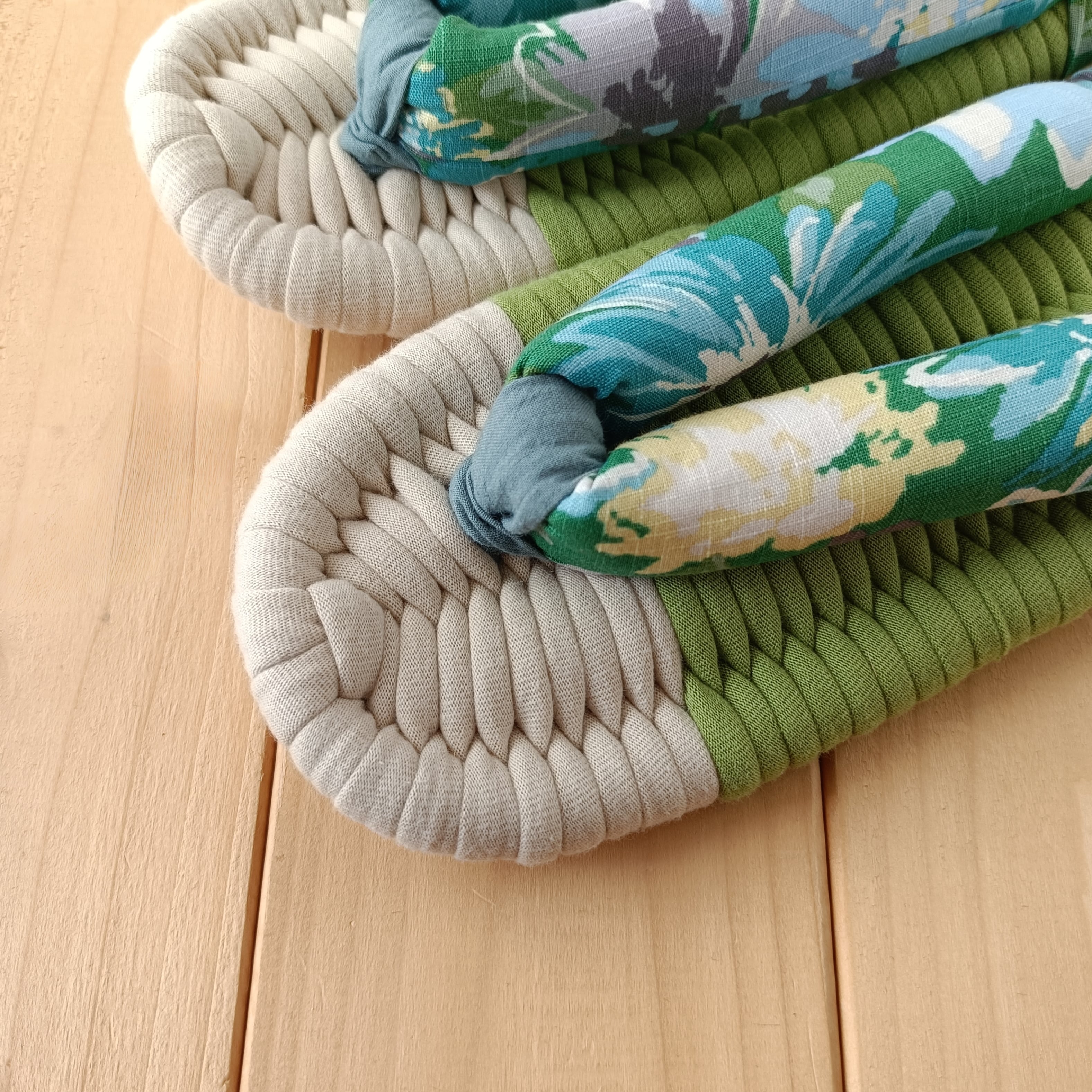 土台・鼻緒には、いろいろな種類の生地を使用しております。いずれも柔らかく肌触りのよい生地をお選びしておりますが、作品により履き心地が多少異なる場合があります。