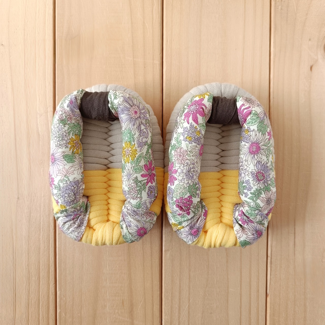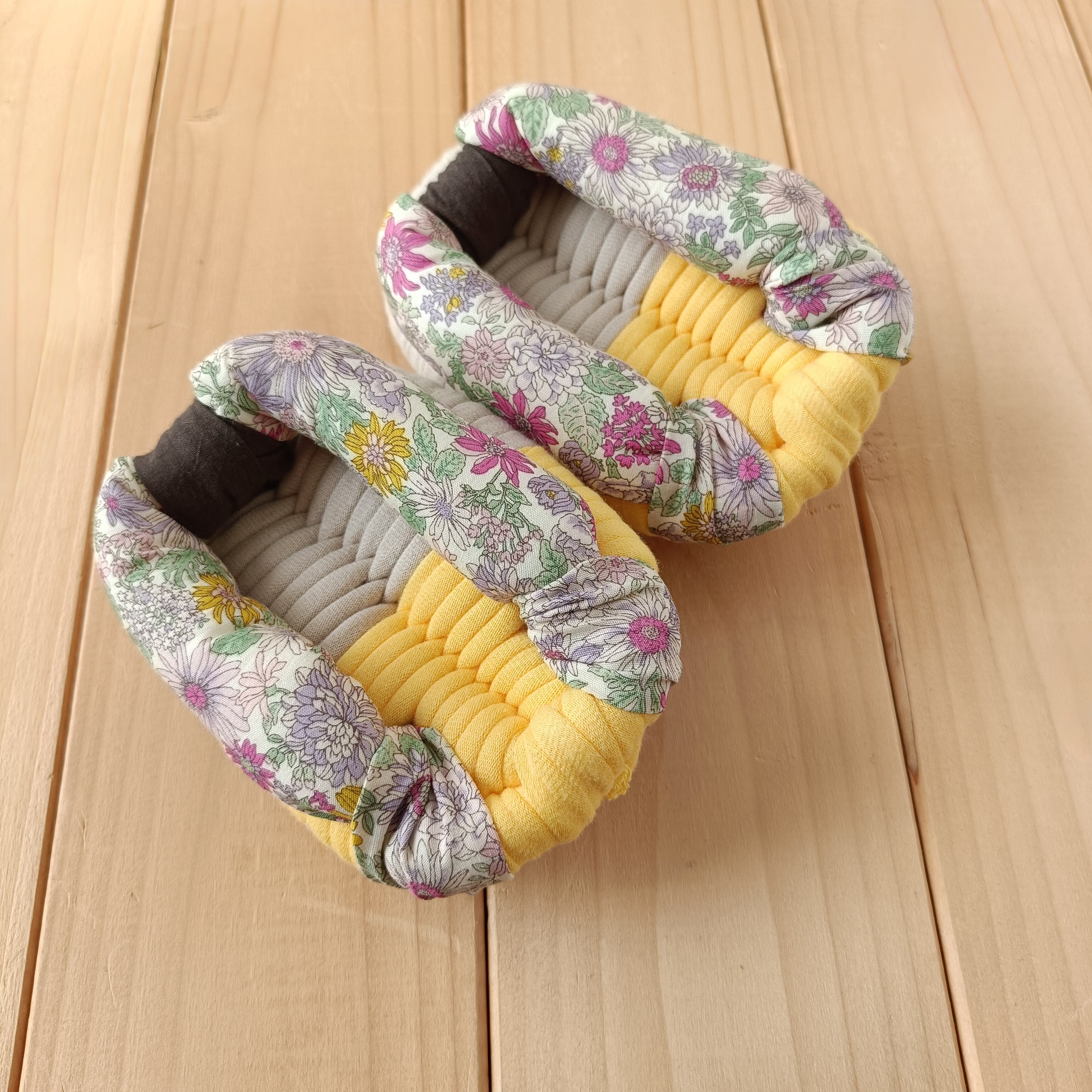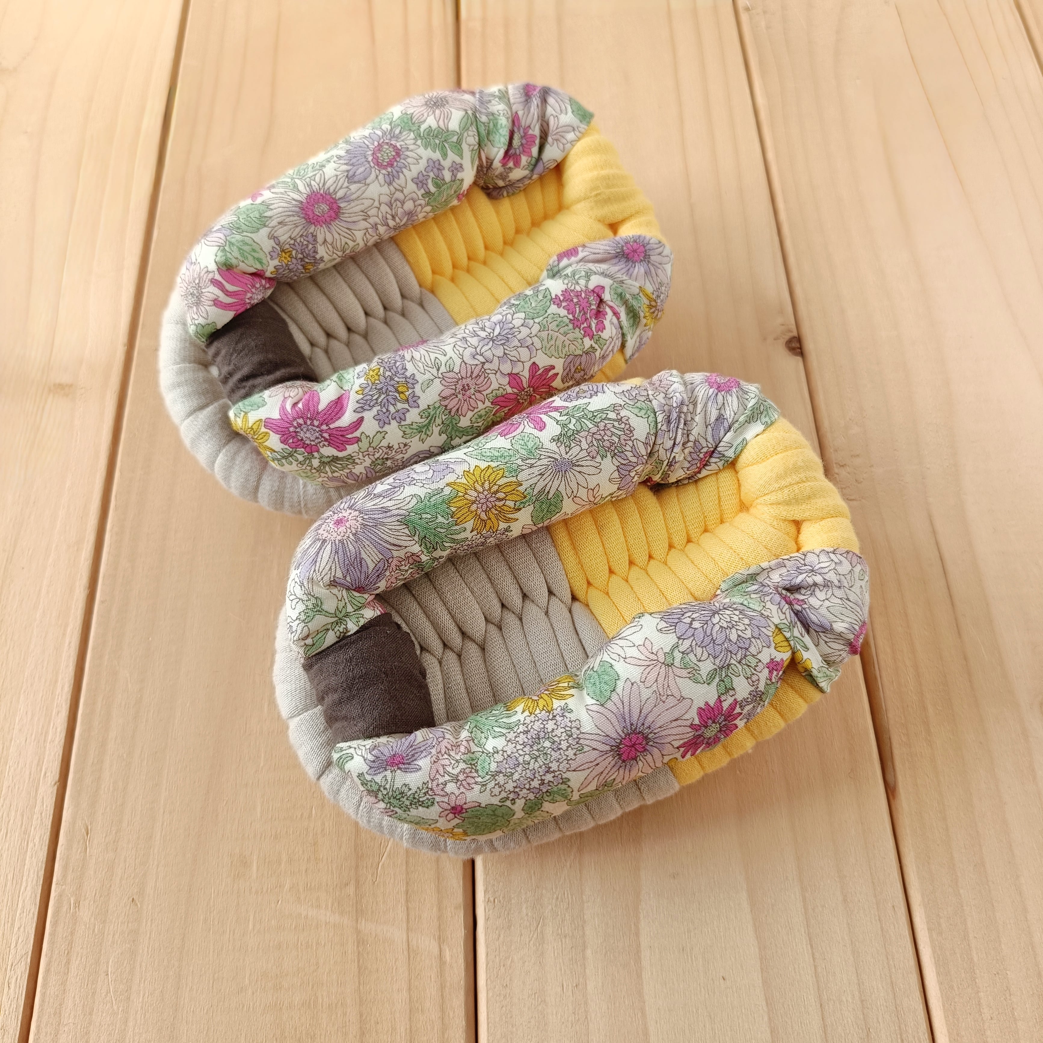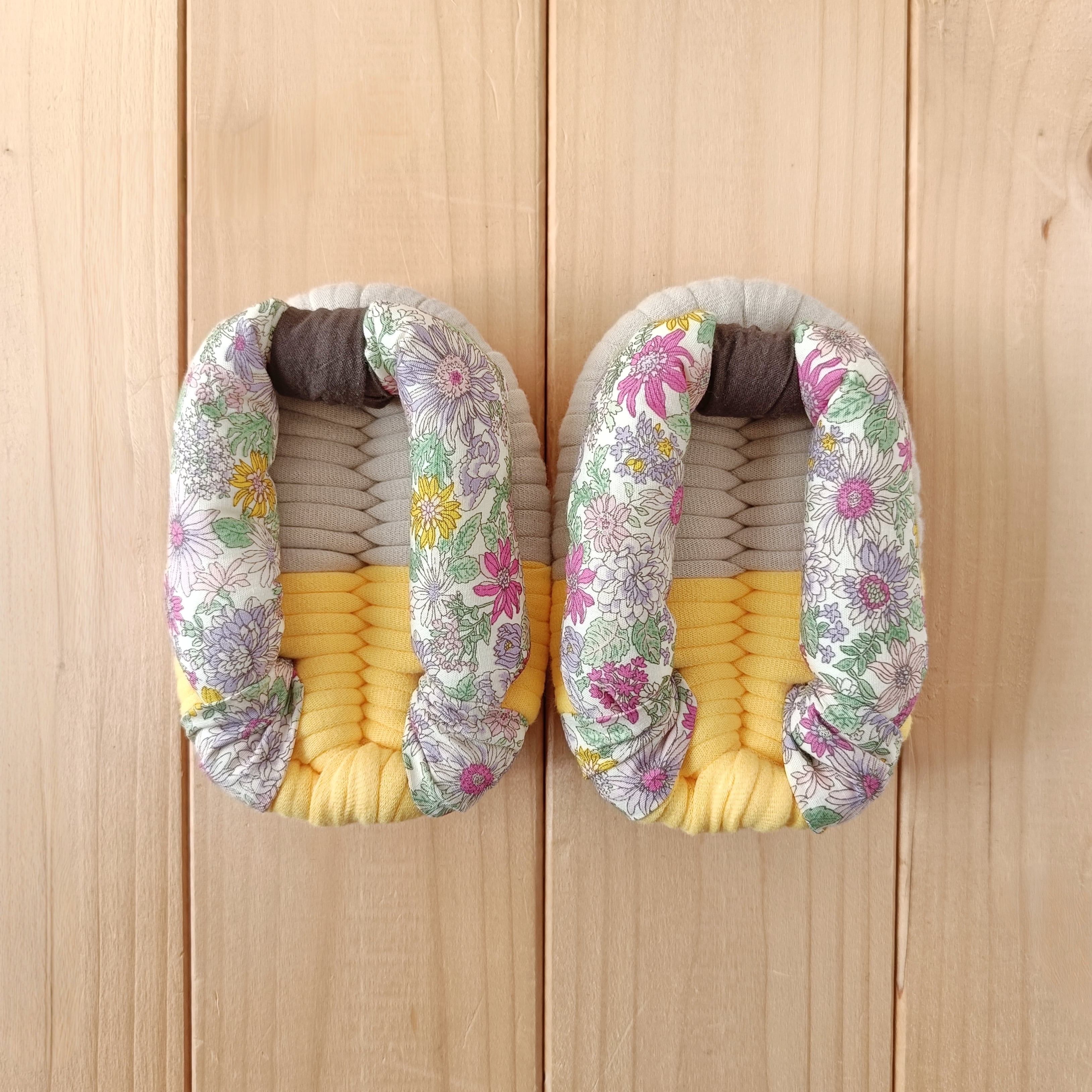 土台・鼻緒には、いろいろな種類の生地を使用しております。いずれも柔らかく肌触りのよい生地をお選びしておりますが、作品により履き心地が多少異なる場合があります。