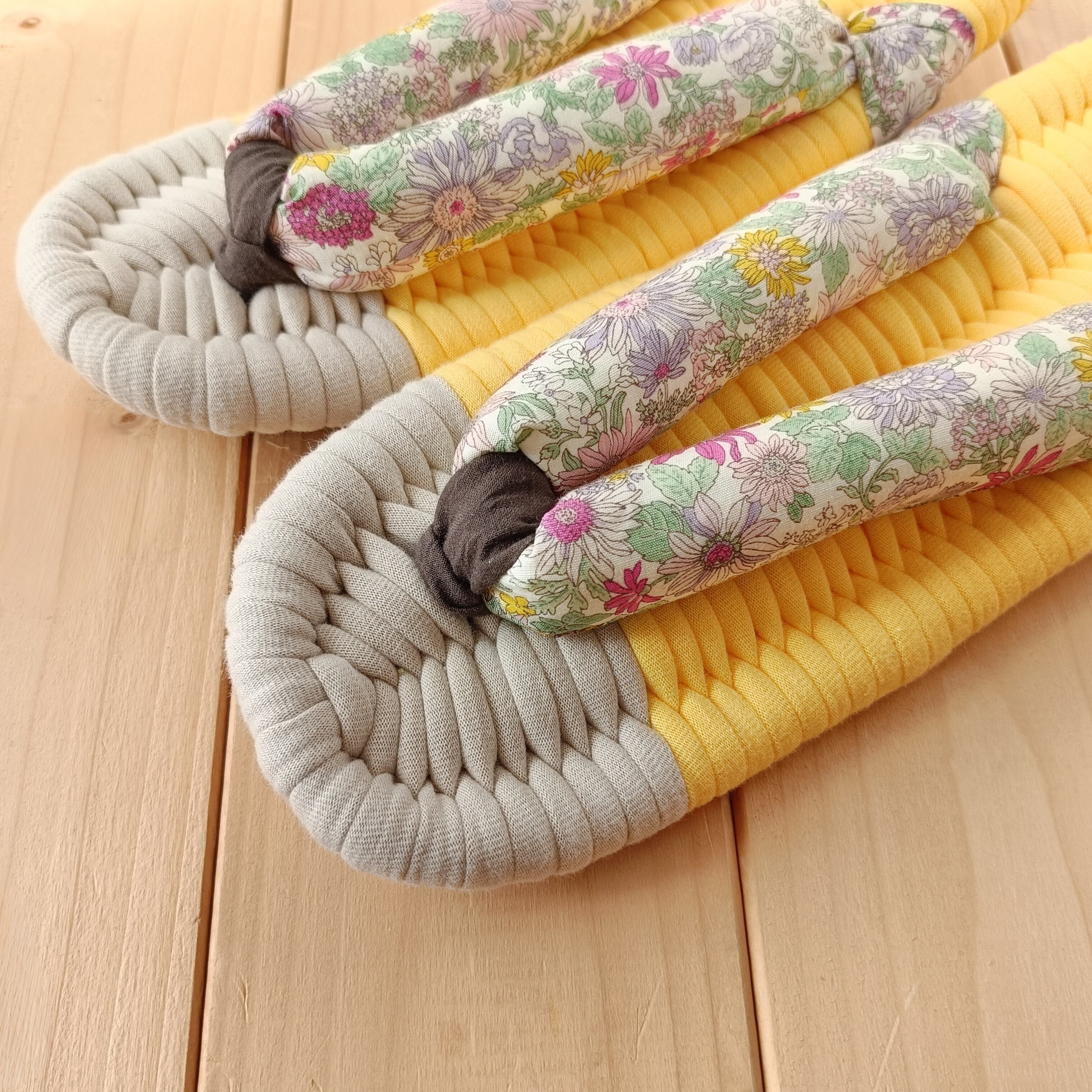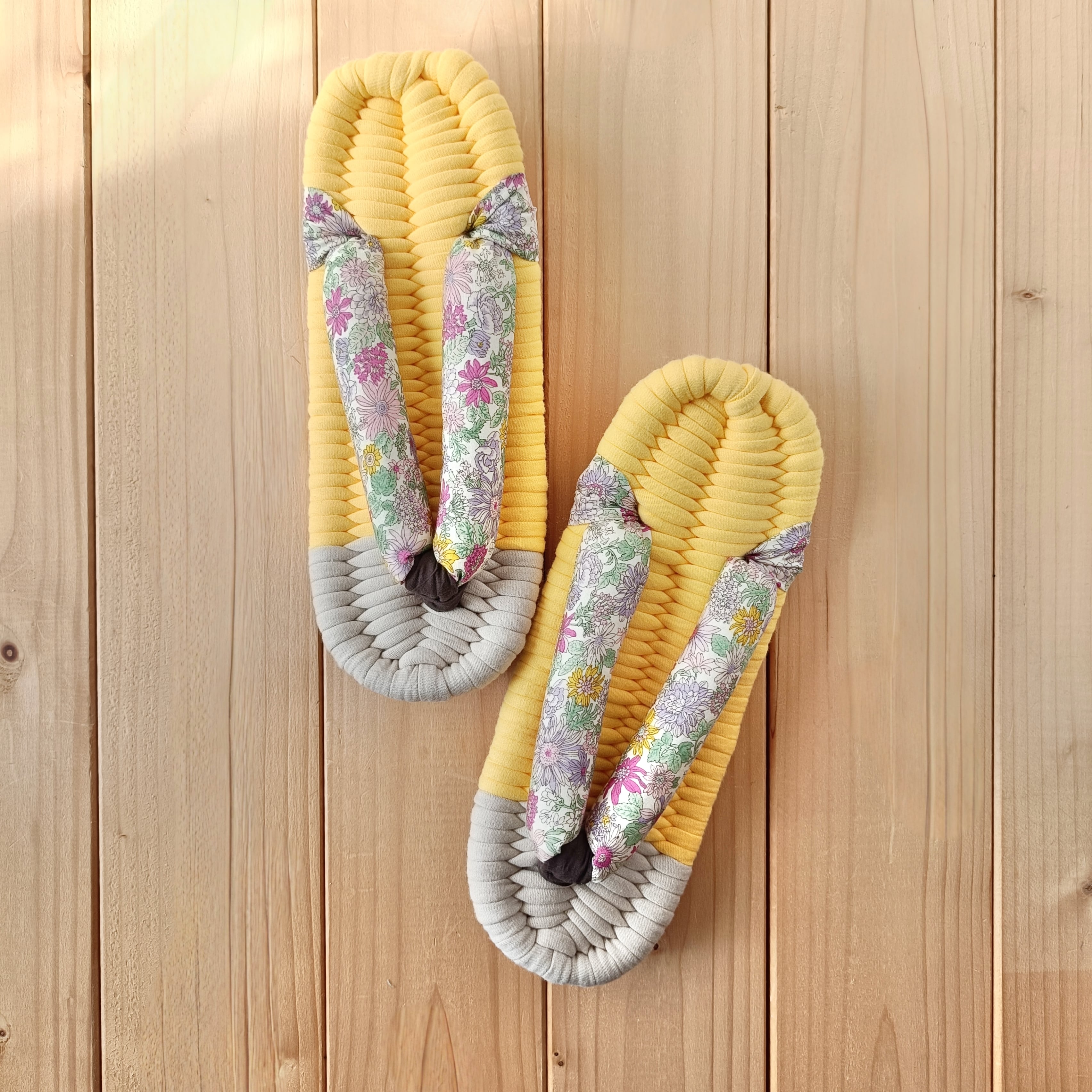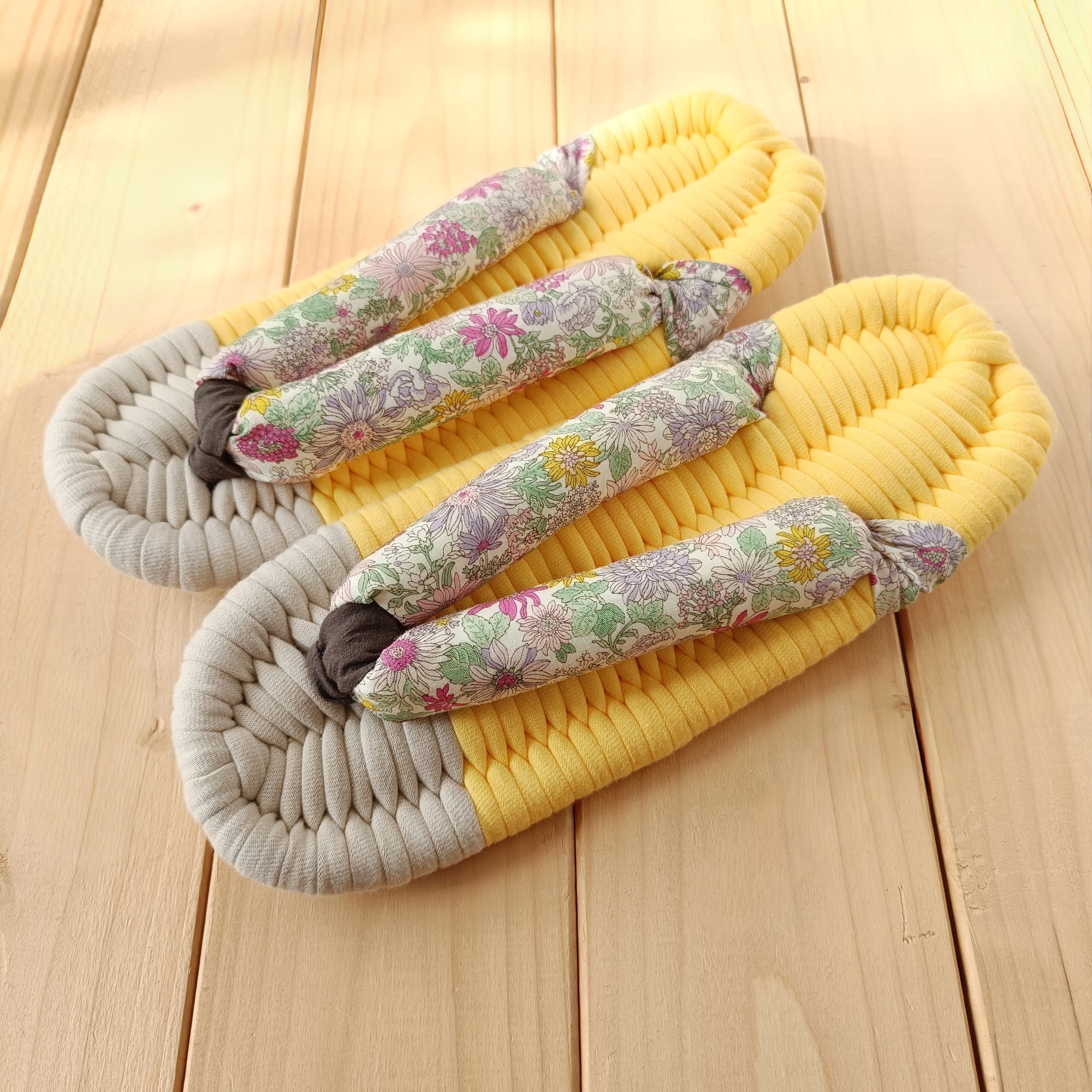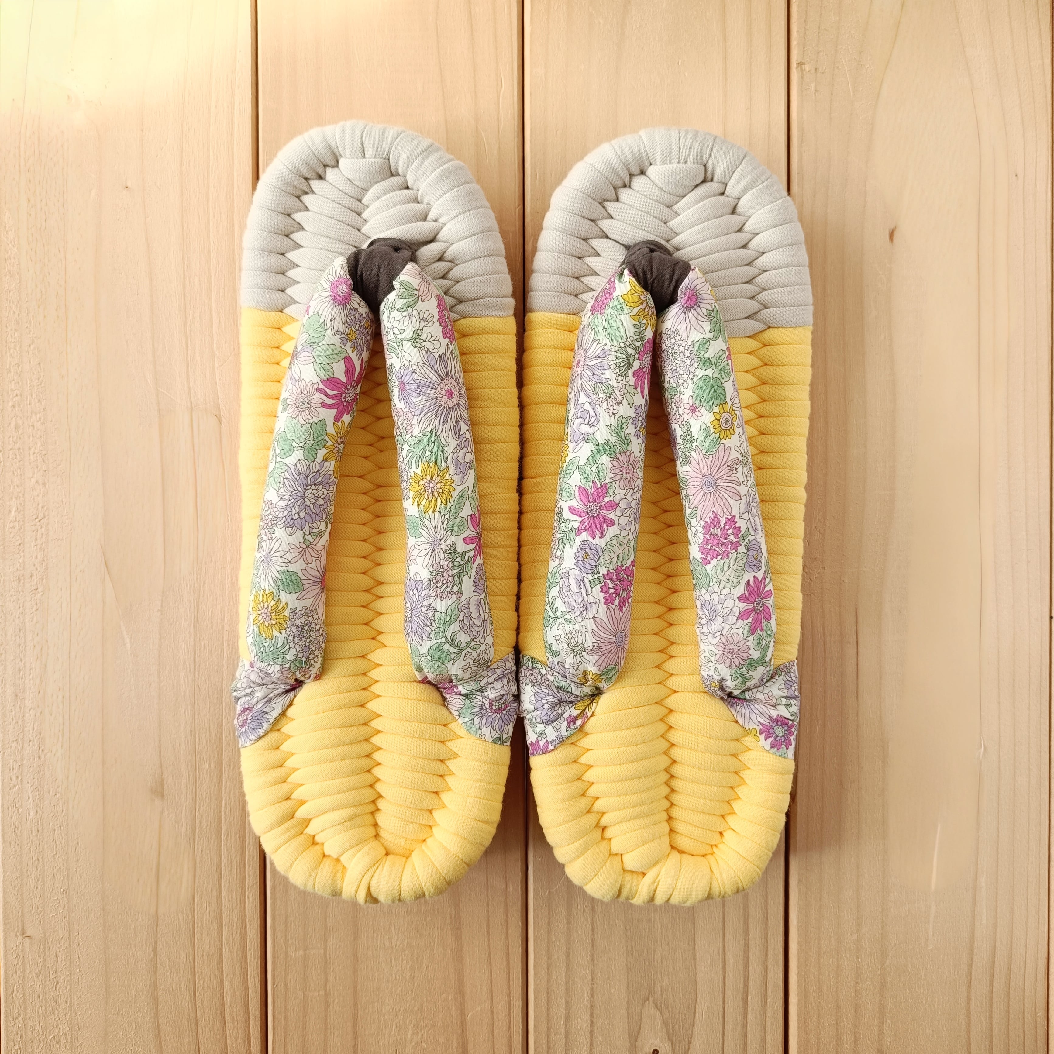 土台・鼻緒には、いろいろな種類の生地を使用しております。いずれも柔らかく肌触りのよい生地をお選びしておりますが、作品により履き心地が多少異なる場合があります。