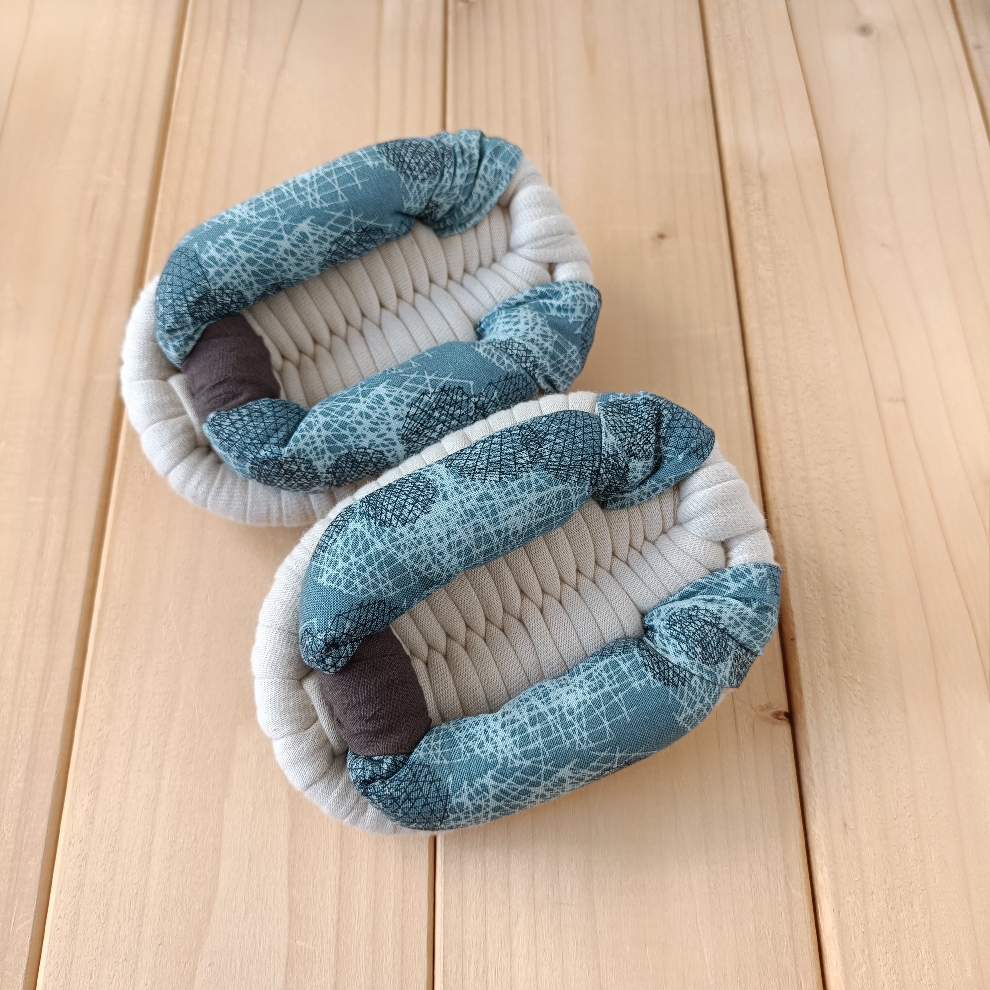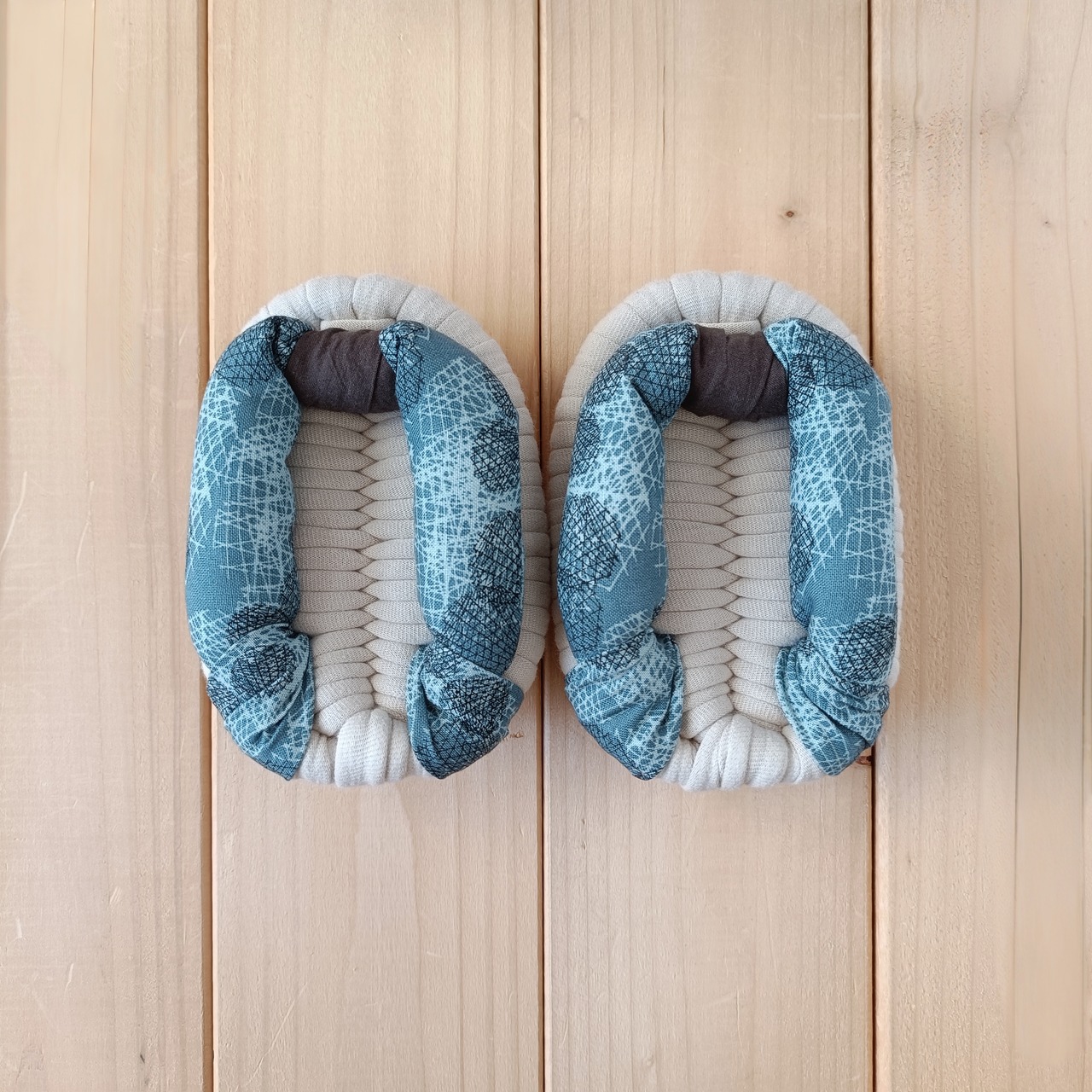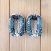 土台・鼻緒には、いろいろな種類の生地を使用しております。いずれも柔らかく肌触りのよい生地をお選びしておりますが、作品により履き心地が多少異なる場合があります。