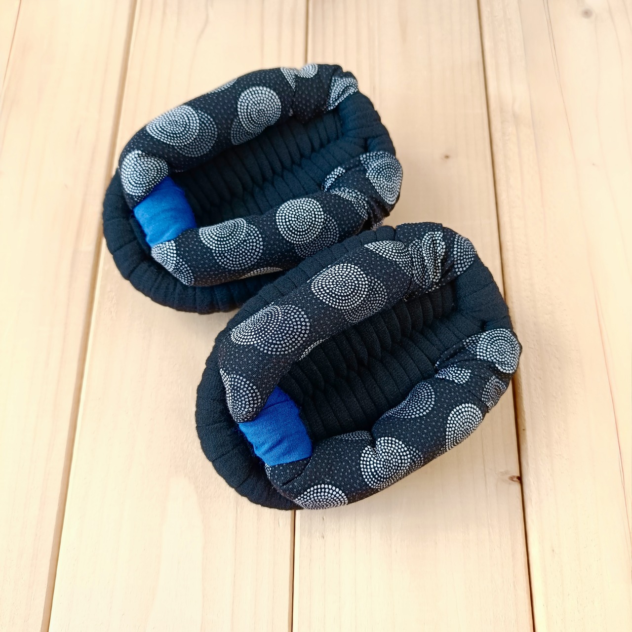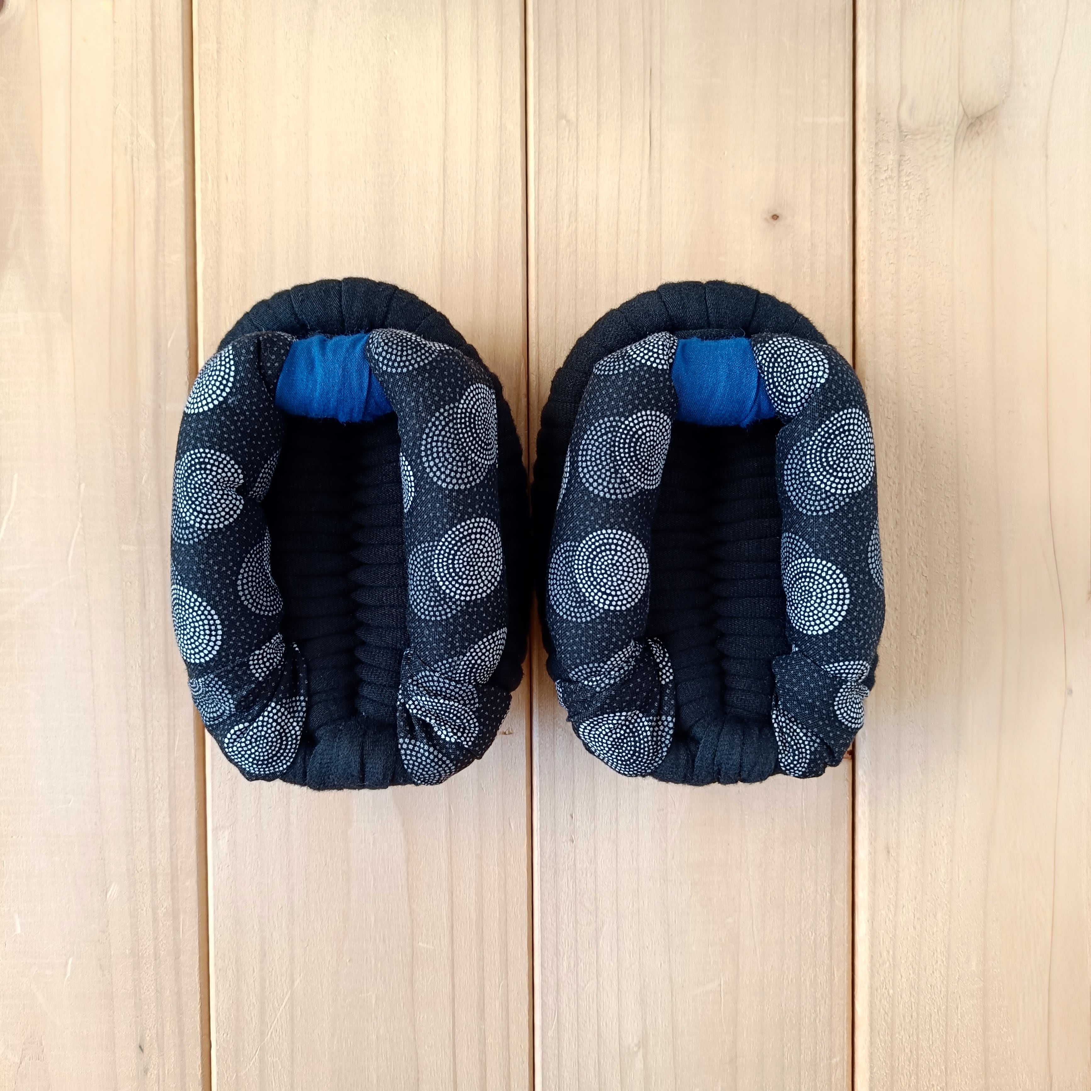 土台・鼻緒には、いろいろな種類の生地を使用しております。いずれも柔らかく肌触りのよい生地をお選びしておりますが、作品により履き心地が多少異なる場合があります。