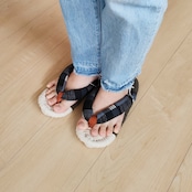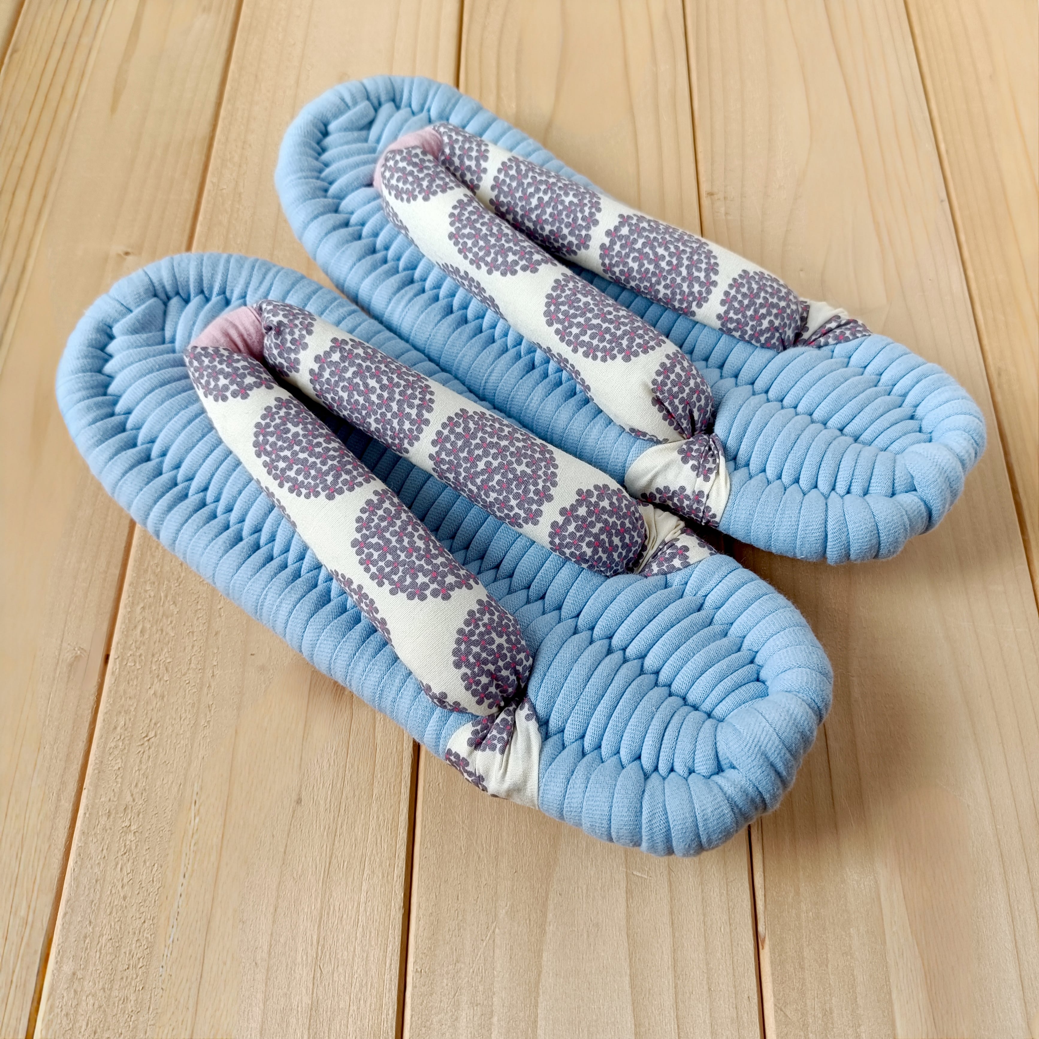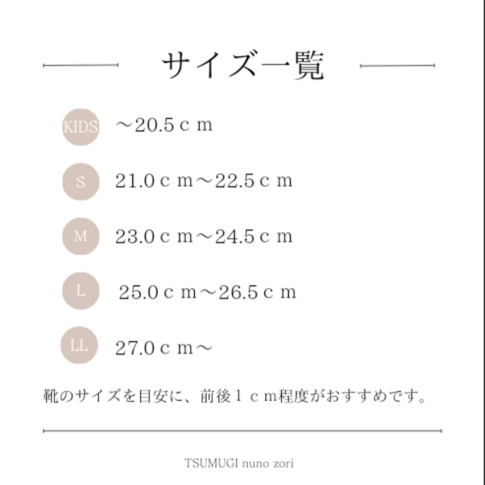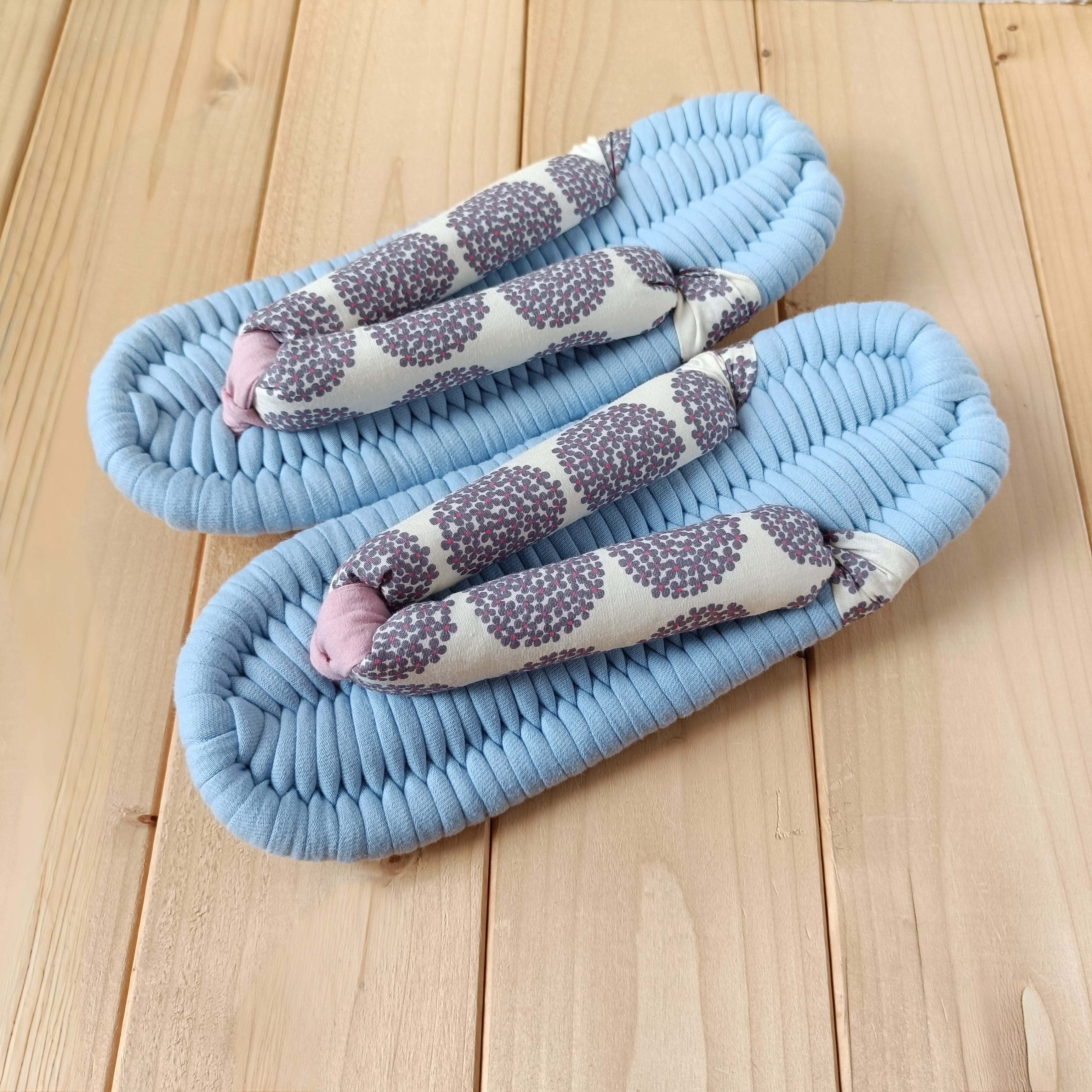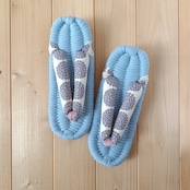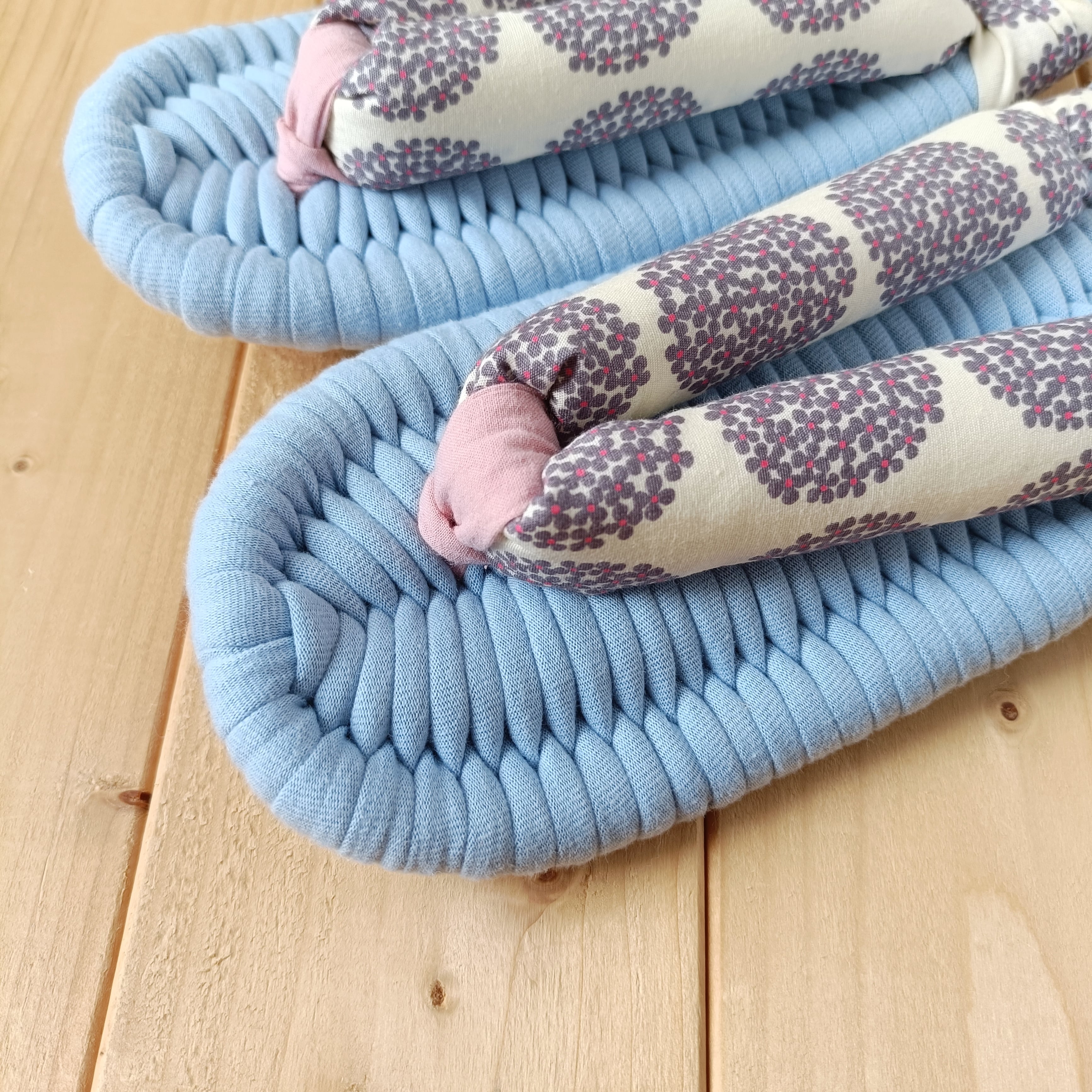 土台・鼻緒には、いろいろな種類の生地を使用しております。いずれも柔らかく肌触りのよい生地をお選びしておりますが、作品により履き心地が多少異なる場合があります。