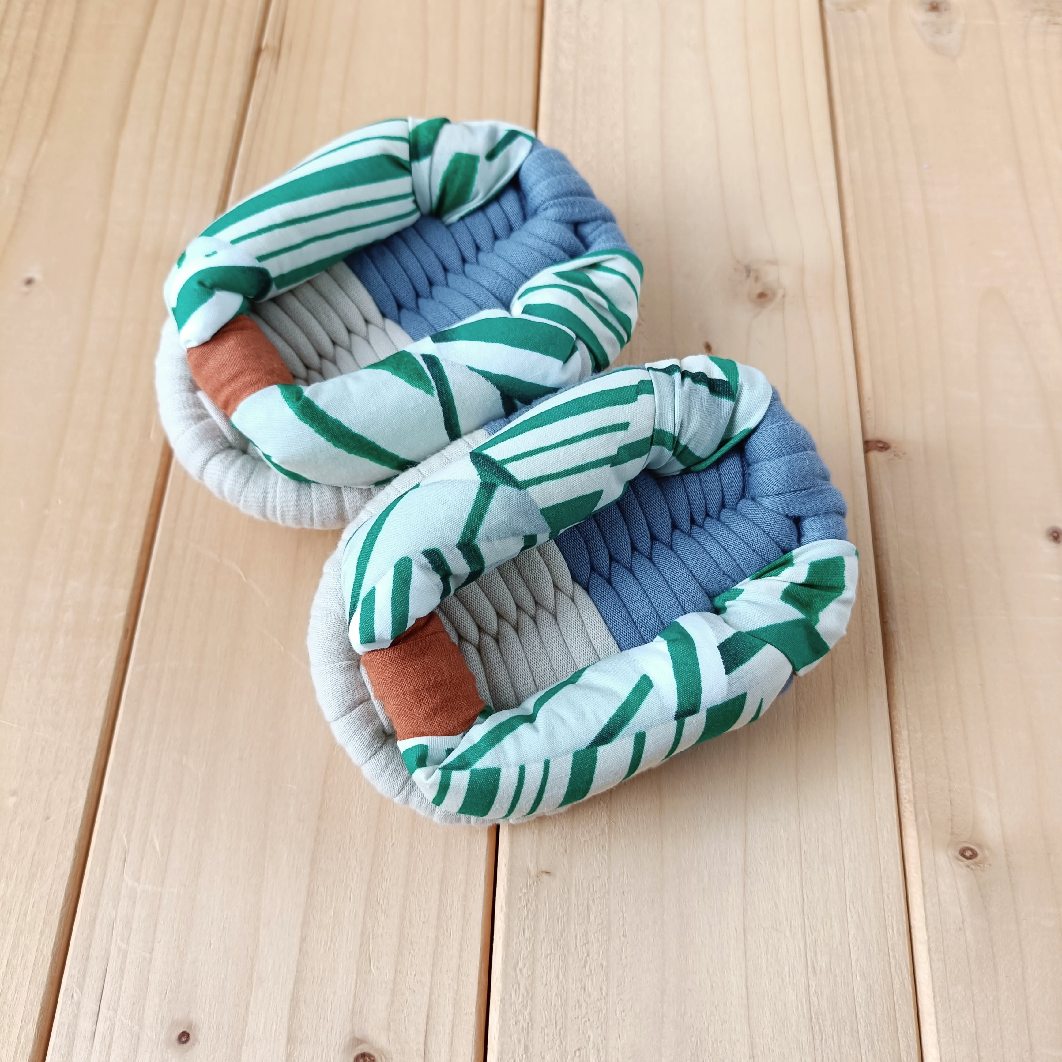 土台・鼻緒には、いろいろな種類の生地を使用しております。いずれも柔らかく肌触りのよい生地をお選びしておりますが、作品により履き心地が多少異なる場合があります。