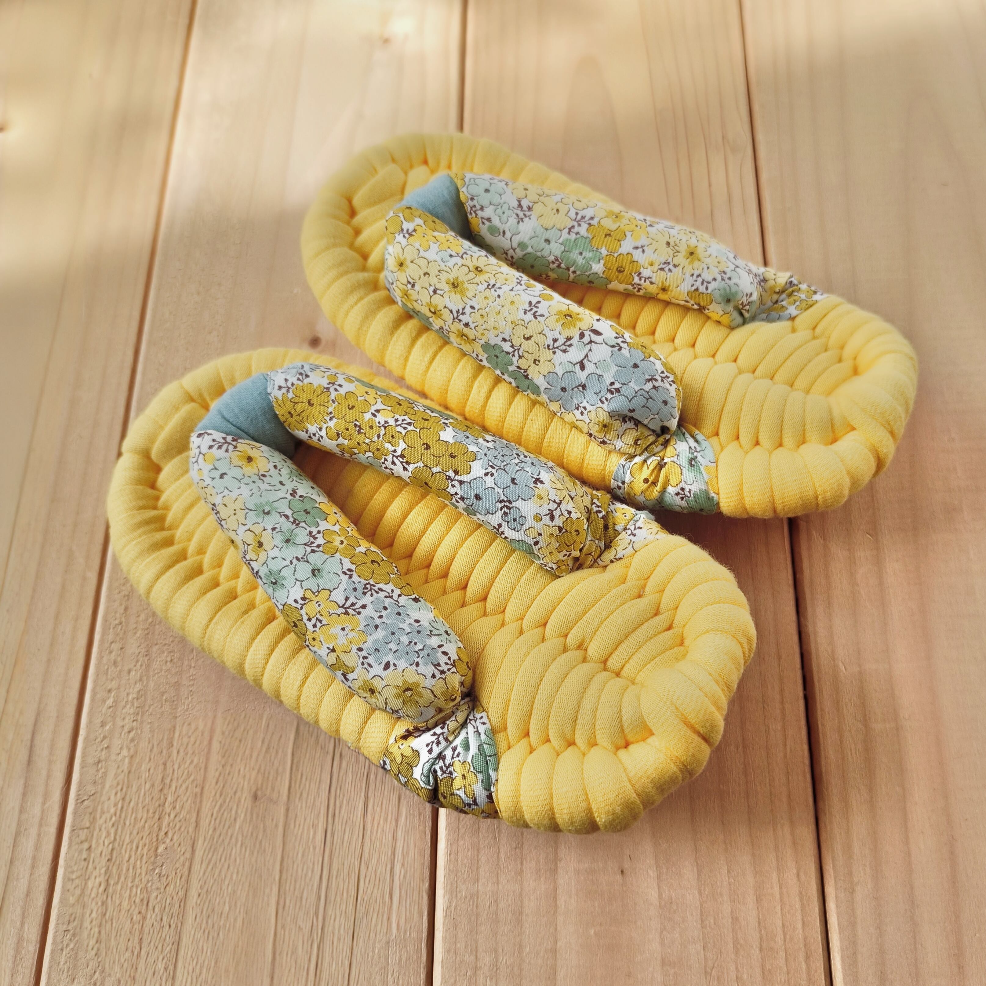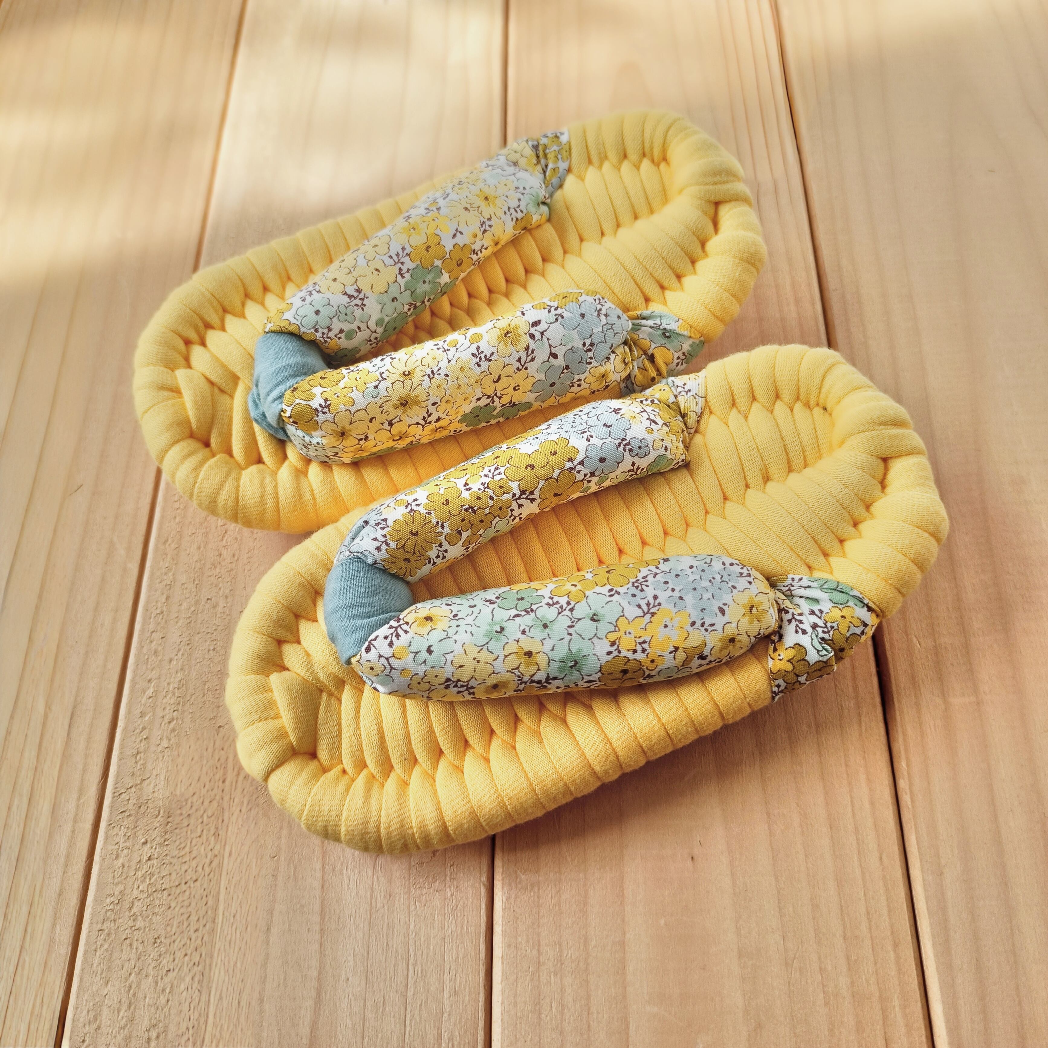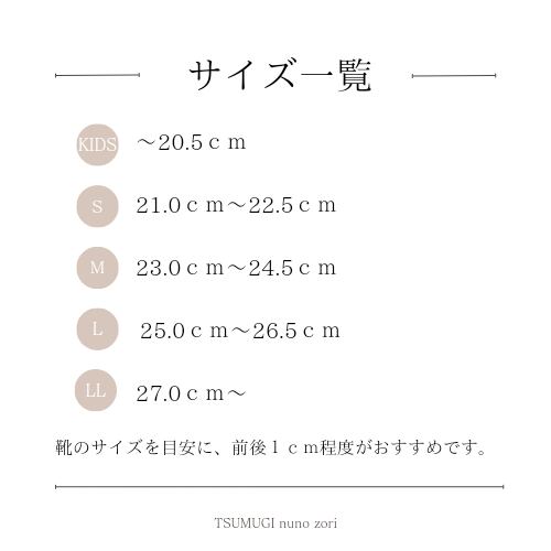 土台・鼻緒には、いろいろな種類の生地を使用しております。いずれも柔らかく肌触りのよい生地をお選びしておりますが、作品により履き心地が多少異なる場合があります。