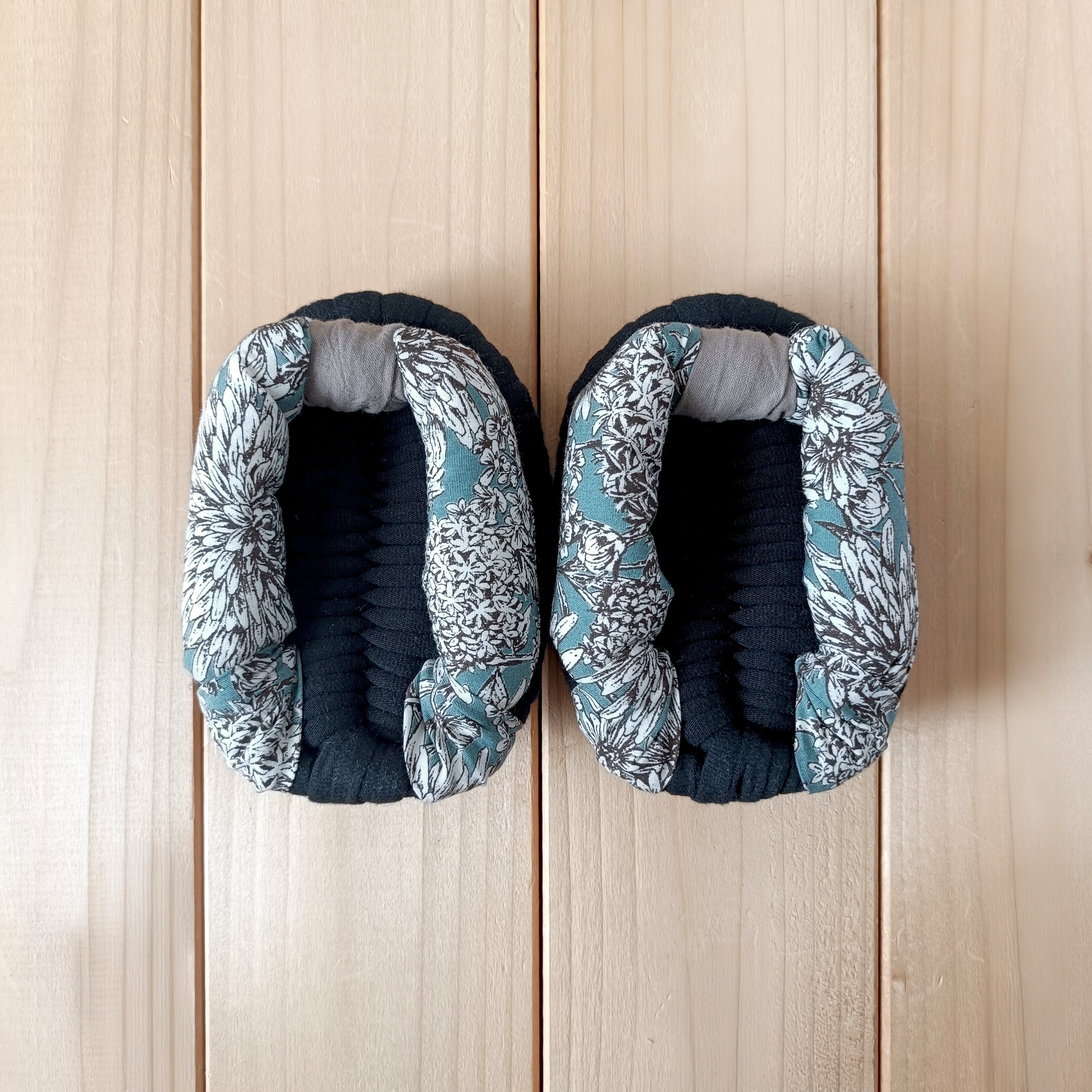 土台・鼻緒には、いろいろな種類の生地を使用しております。いずれも柔らかく肌触りのよい生地をお選びしておりますが、作品により履き心地が多少異なる場合があります。