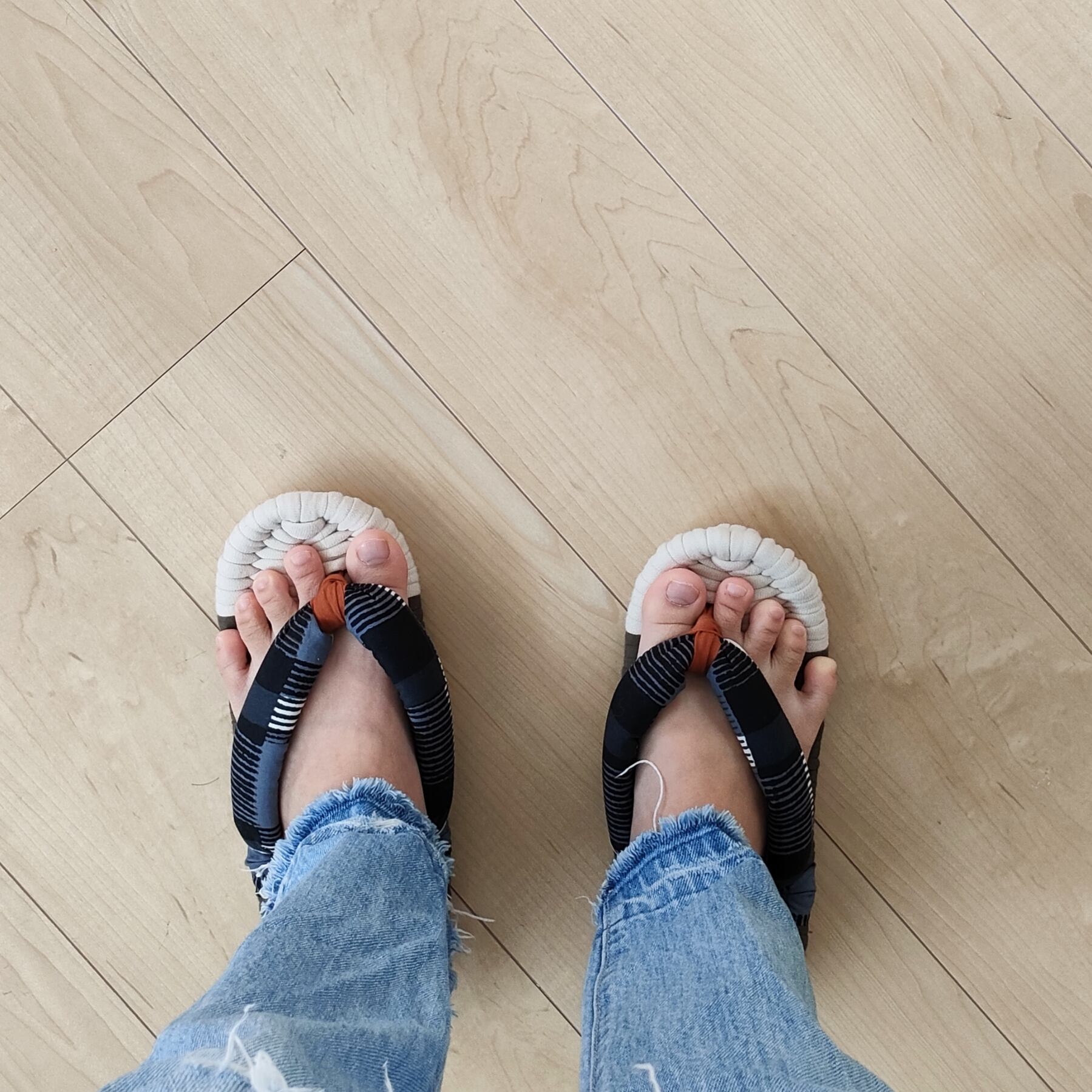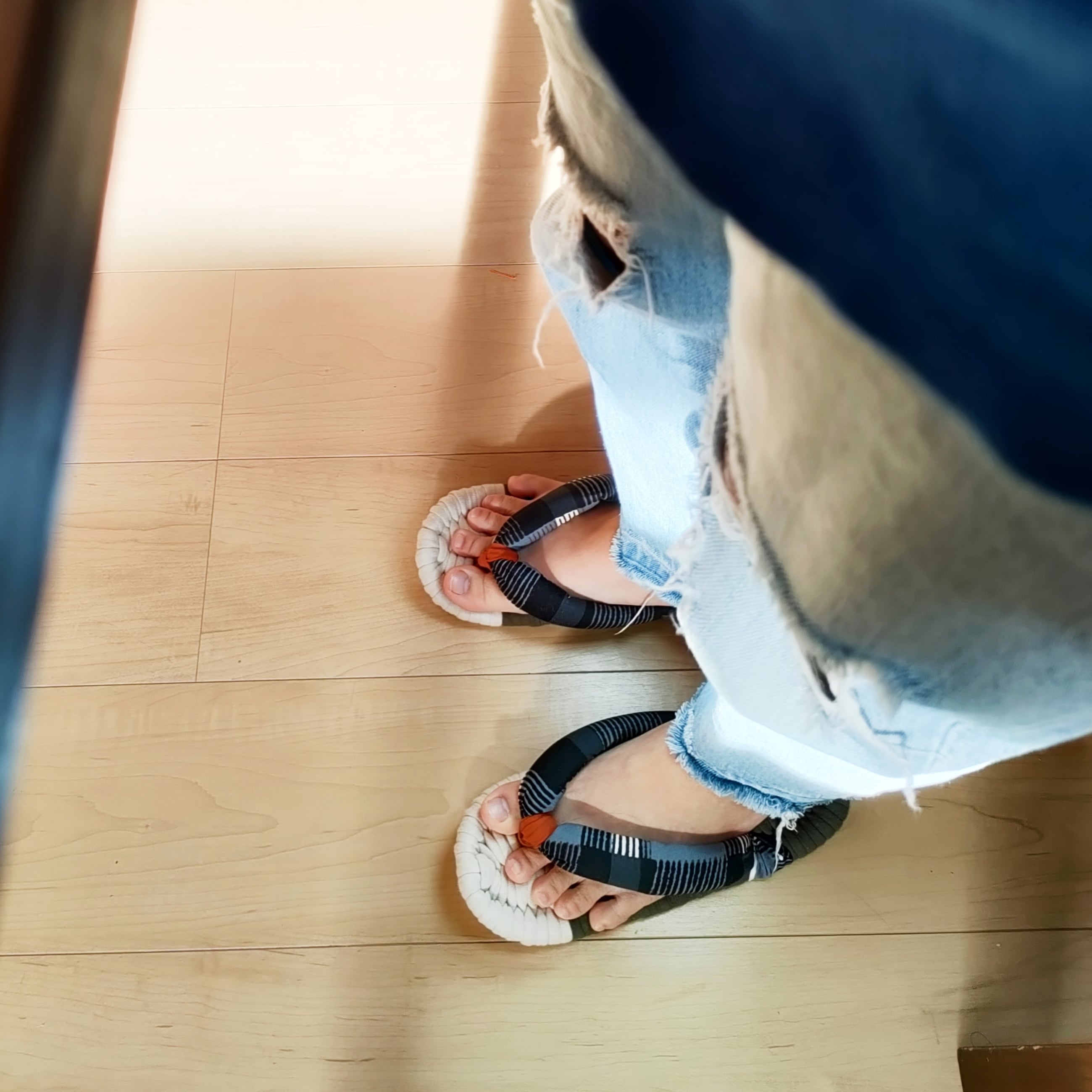土台・鼻緒には、いろいろな種類の生地を使用しております。いずれも柔らかく肌触りのよい生地をお選びしておりますが、作品により履き心地が多少異なる場合があります。