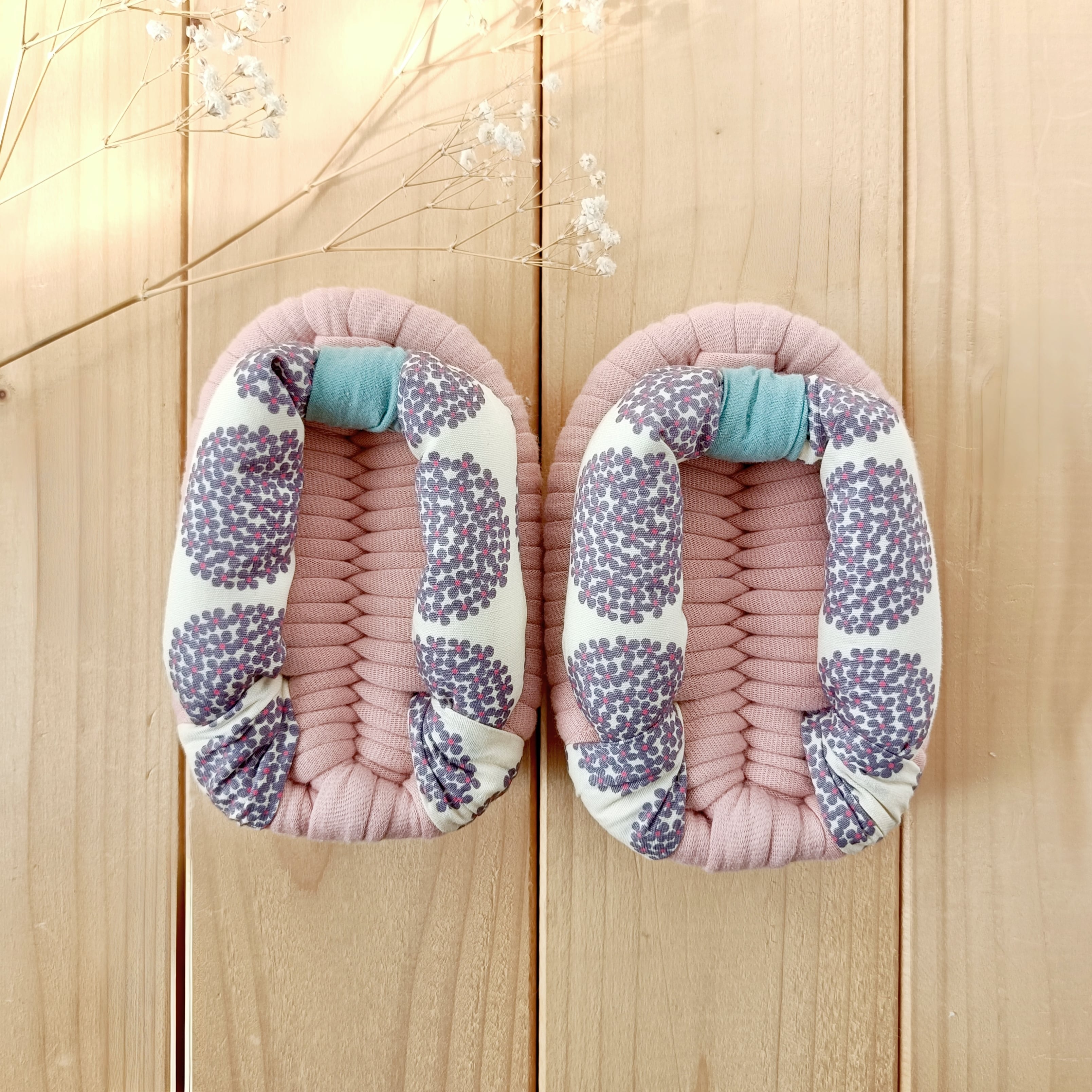 土台・鼻緒には、いろいろな種類の生地を使用しております。いずれも柔らかく肌触りのよい生地をお選びしておりますが、作品により履き心地が多少異なる場合があります。