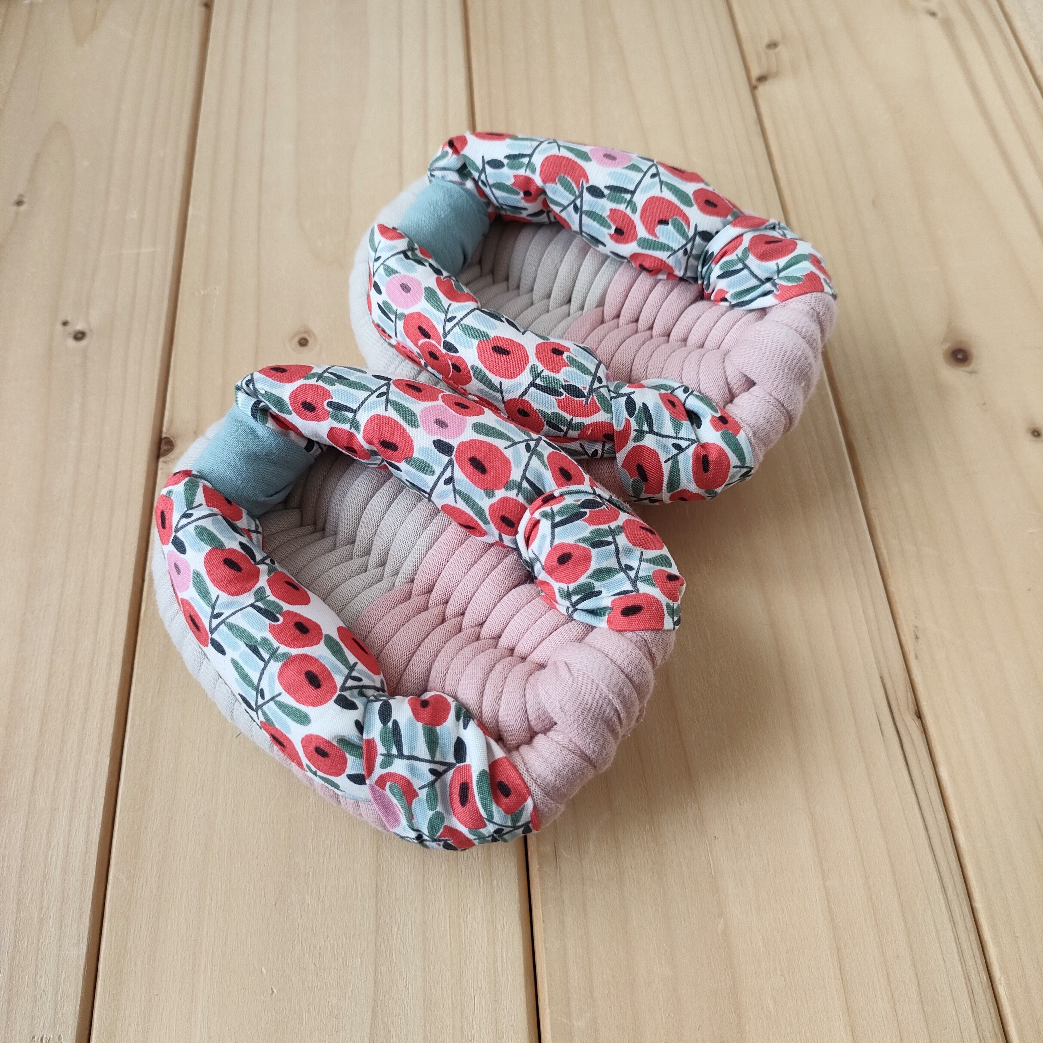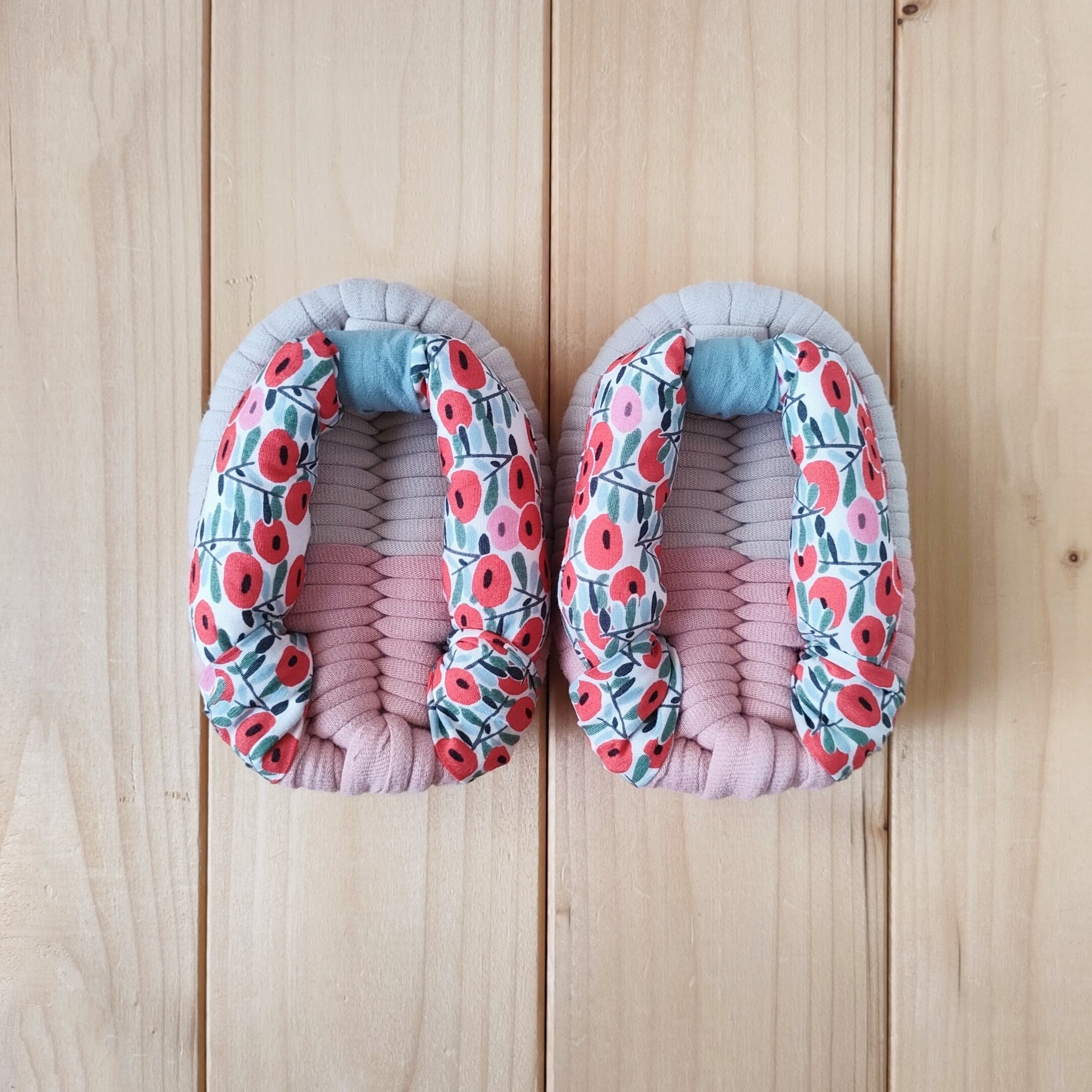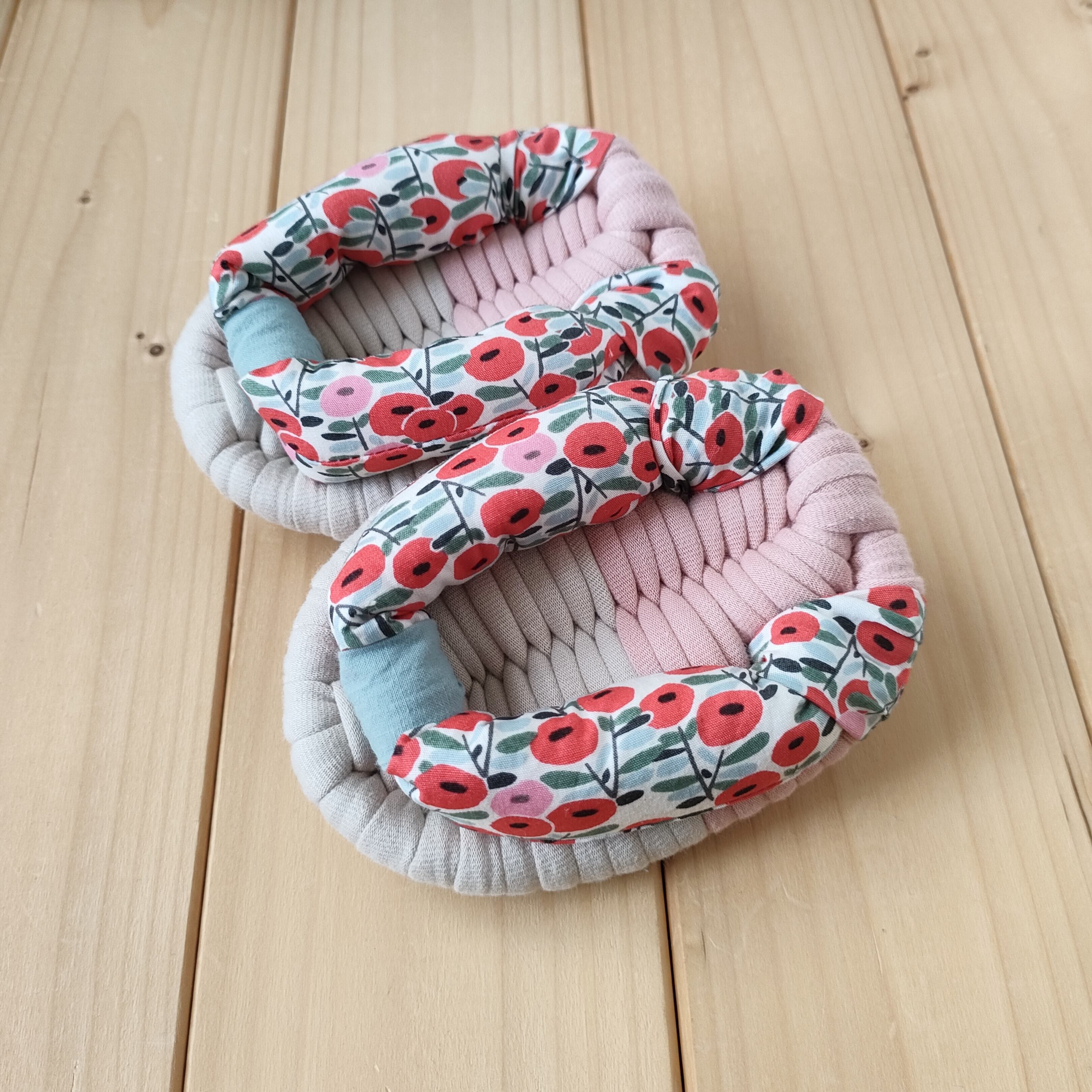 土台・鼻緒には、いろいろな種類の生地を使用しております。いずれも柔らかく肌触りのよい生地をお選びしておりますが、作品により履き心地が多少異なる場合があります。
